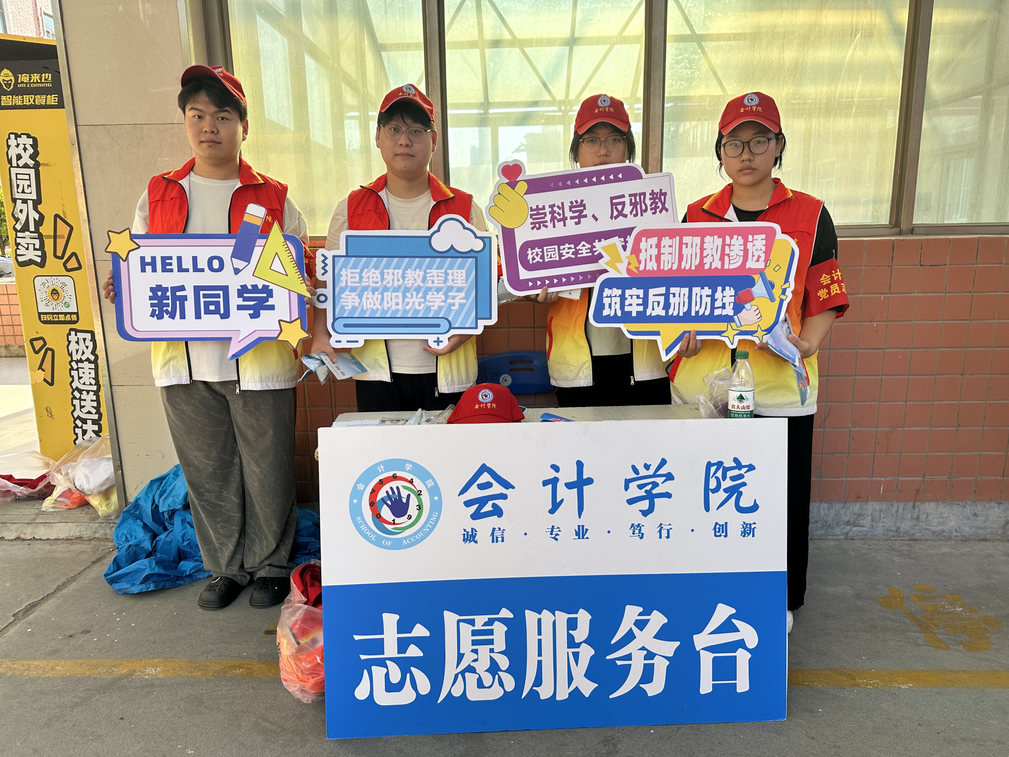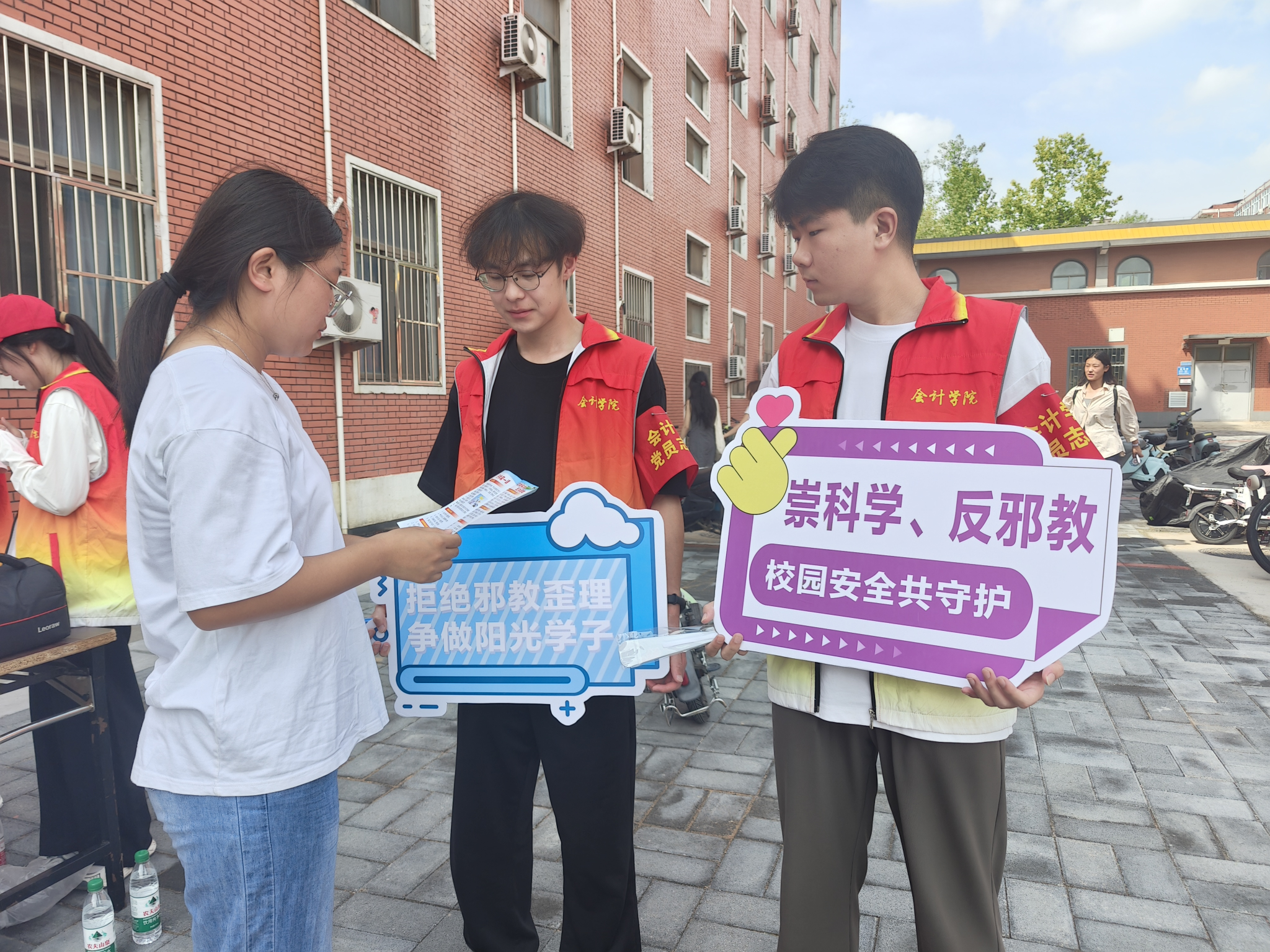 系列活动以“树牢国家安全观崇尚科学树新风”为主题,通过多形式、多层次的教育载体,切实将反邪教教育融入新生入学教育活动中。校园迎新期间,会计学院党员志愿者以2025级新生为主要宣传对象,通过发放宣传用品和现场讲解的形式开展宣传。一方面,向新生发放反邪教宣传教育手册、宣传扇及手提袋等纪念品;另一方面,结合手册内容,现场为新生详细介绍邪教的常见骗术、严重危害与主要特征。志愿者们特别提醒新同学,要提高警惕、科学辨别,自觉远离邪教;若发现邪教活动,需第一时间向公安机关举报;要牢固树立科学世界观,主动抵制各类迷信行为。