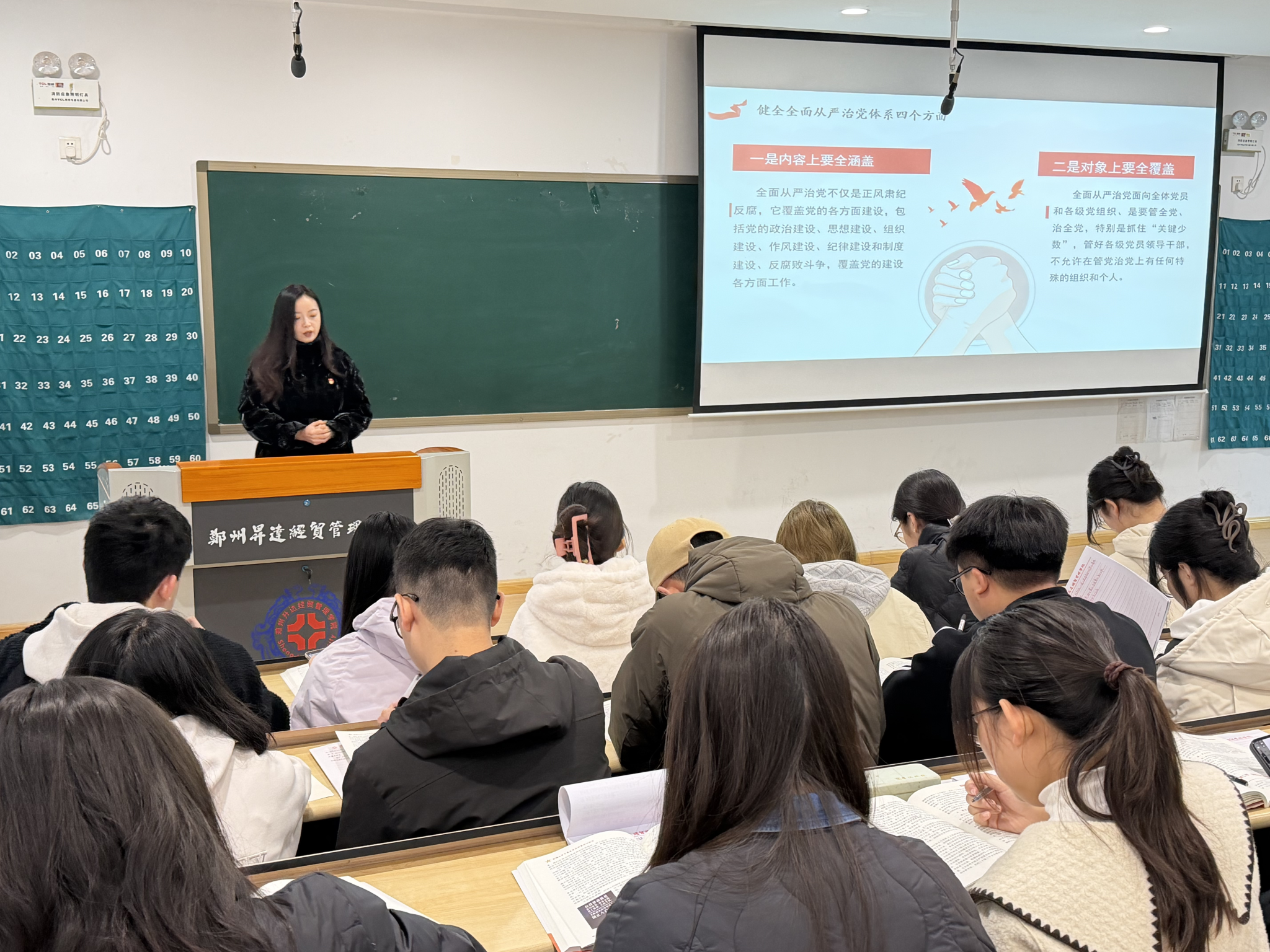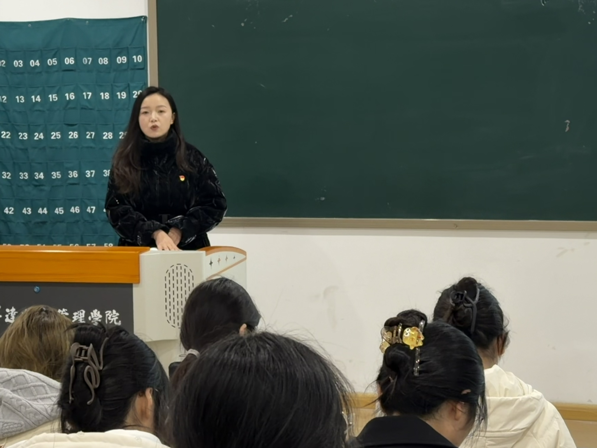 2025年11月6日,会计学院会计学专业学生第六党支部书记焦阳在4号楼108教室,为第22期发展对象讲授主题为“行而不辍,履践致远——深入推进新时代党的建设新的伟大工程”专题党课。