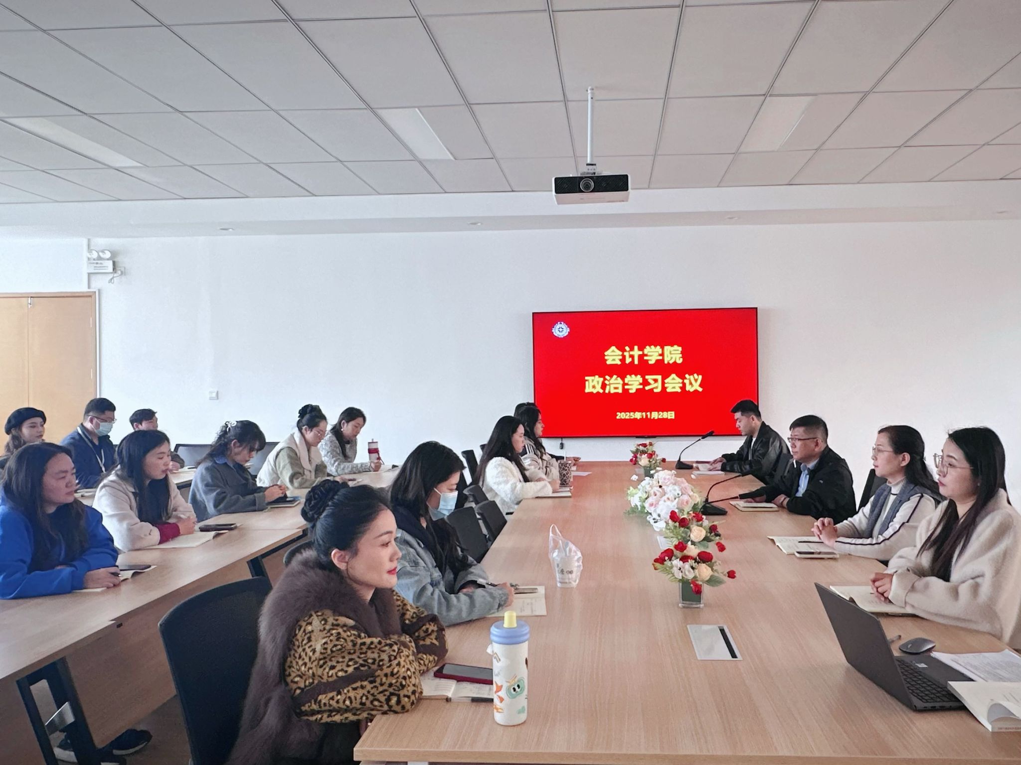 2025年11月28日,会计学院在4号楼209会议室组织集中政治学习。本次会议由学院党委书记张蕾主持,学院党委副书记兼团委书记陈刚、学生党支部书记、全体辅导员和组织员等参加。