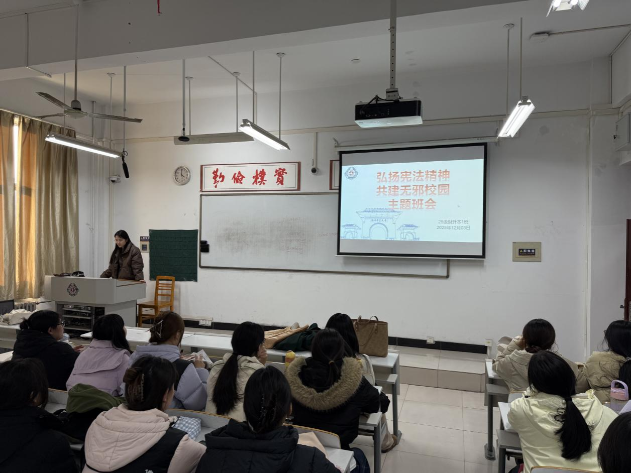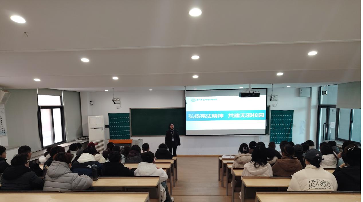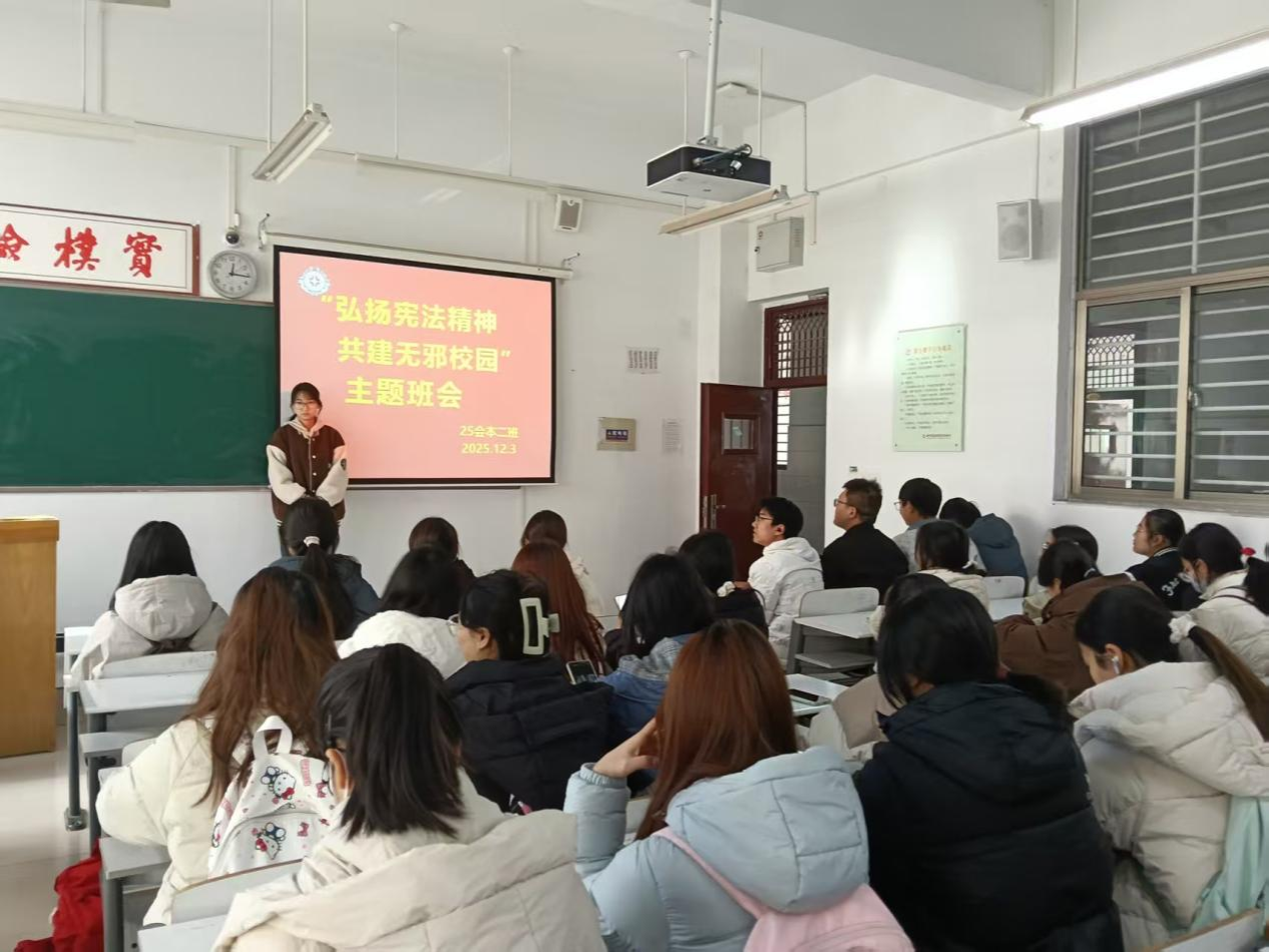 本次活动紧扣活动主题,开展了多种形式的宣传教育活动。学院以班级为单位全覆盖召开主题班会,通过宪法知识讲解、典型案例剖析、互动问答等形式,向学生深入阐述宪法作为国家根本大法的核心地位,大力弘扬宪法精神。同时,还系统讲解了邪教的危害性以及识别邪教的技巧,引导学生树立“不听、不信、不传、不参与”的防范意识。此外学院还通过悬挂宣传标语的形式,营造了“弘扬宪法精神 共建无邪校园”的活动氛围。