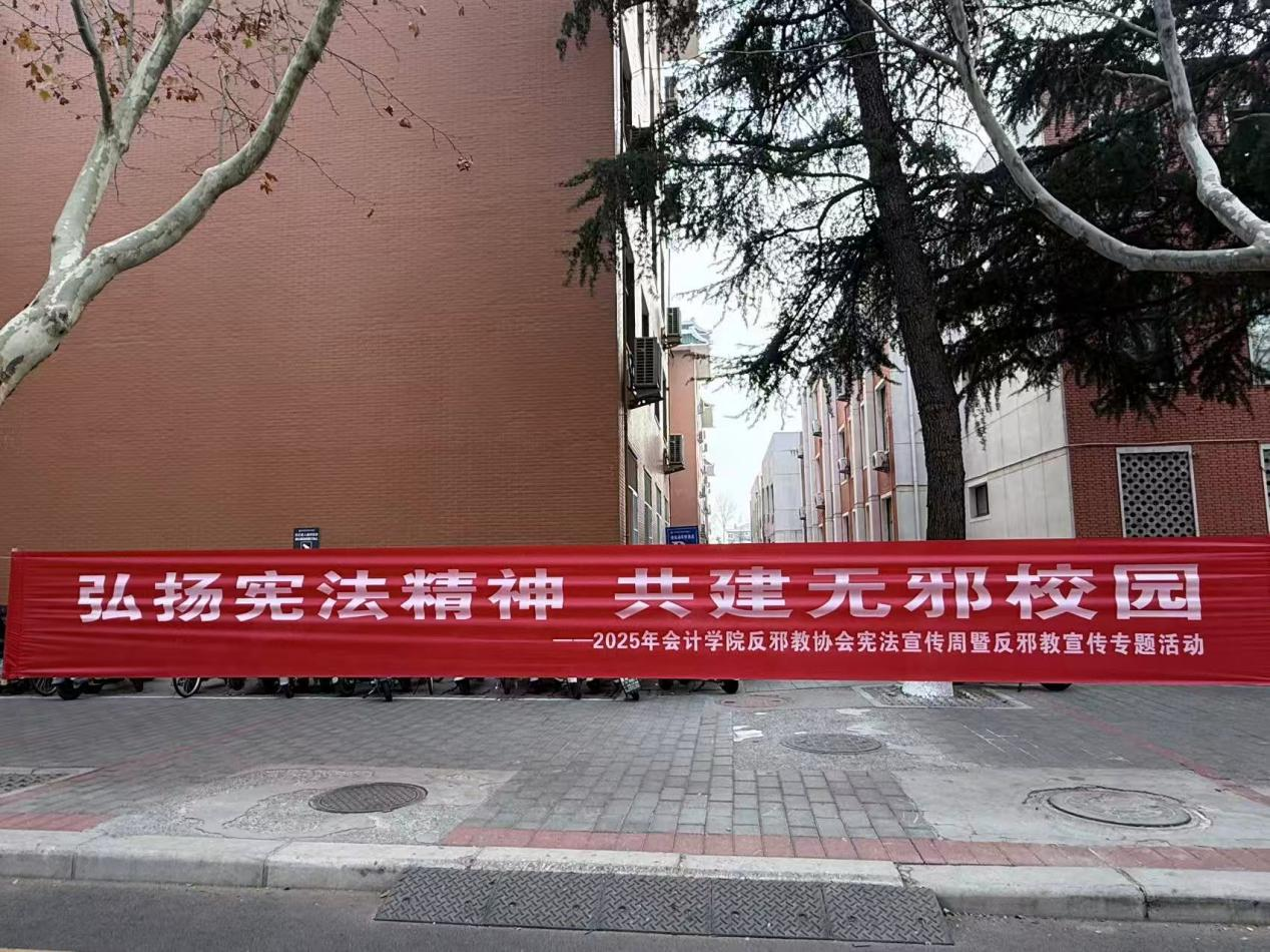 为深入学习贯彻习近平新时代中国特色社会主义思想,根据学校关于开展2025年宪法宣传周暨反邪教宣传教育活动的通知要求,近日,会计学院反邪教协会以“弘扬宪法精神 共建无邪校园”为主题,组织开展了系列宣传教育活动。