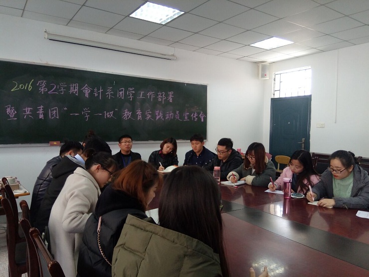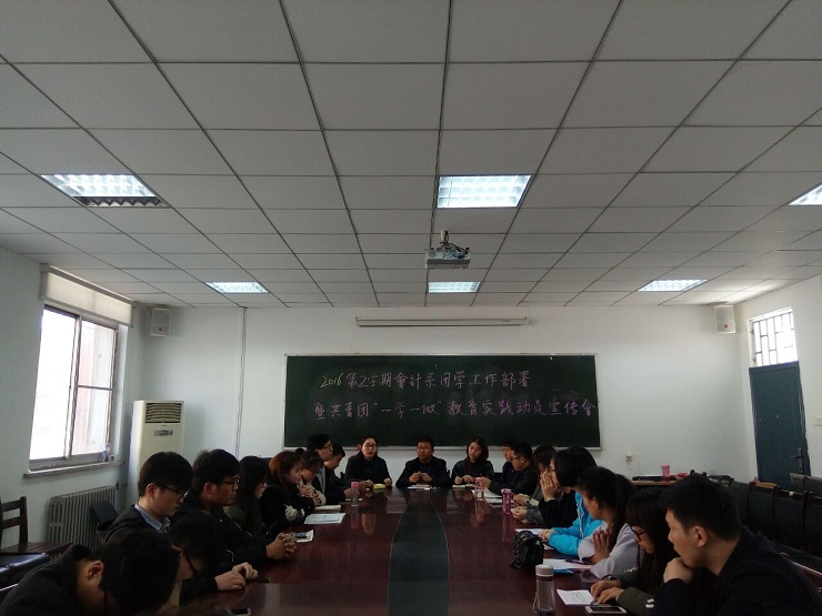 万物复苏,鸟语花香。为迎接新的学期的到来,更好的进行新学期团学各方面的工作,同时,也为了推动会计系团委学生会思想教育,深入贯彻落实团中央关于在全团开展“一学一做”教育实践活动的精神。3月1日中午12:15,会计系于教学一号楼114会议室召开了新学期团学工作部署暨共青团“一学一做”教育实践动员宣传会。会计系行政秘书兼团委书记陈刚老师,以团委副书记安琪、学生会主席安焱焱、社联理事长林佳波为代表的主席团各成员以及团学会各个部门的部长等参加了此次会议。