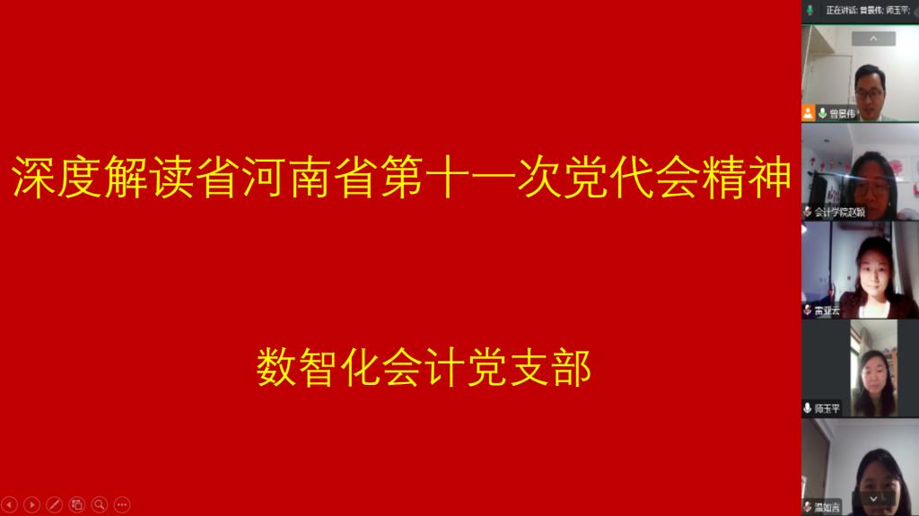 为进一步深入学习中国共产党河南省第十一次代表大会的会议精神,9月22日,数智化会计党支部组织党支部全体党员和教研室所有教师通过线上方式开展政治学习。会议由数智化会计教研室党支部书记曾景伟老师主持。