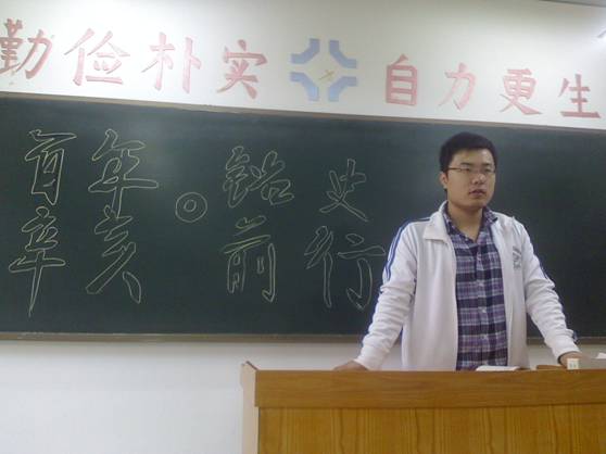 班会在雄伟激情的国歌声中拉开序幕,全班同学怀着崇敬的心情听国歌,缅怀革命先烈。随后夏瑞芳老师简介了纪念辛亥革命一百年的现实意义,号召作为新时代的大学生应紧跟时代潮流、把握时代脉搏、铭记辛亥历史、继承革命精神。并倡议全体团员及预备党员了解历史、知国情、积极向党靠拢。接着班长赵浩辰宣读了胡锦涛总书记在“纪念辛亥革命一百周年的讲话”从新的角度审视了辛亥革命的现实意义和时代青年的历史使命,团支书郑光辉讲了国父孙中山不屈不挠为民族富强不断的奋斗的事迹。再现了孙中山等革命先辈为国家统一、民族团结和中华振兴而奋斗的历史功绩,鼓励同学们学习和发扬革命先烈不畏艰险、不屈不挠的革命意志和积极进取的可贵精神。 随后,同学们相互交流学习心得体会,展开对辛亥革命现实意义讨论。同学李果说:“以前,对辛亥革命也有了解,但不全面,这次的学习让我对孙中山有了一次系统全面的了解,他为振兴中华而矢志不渝的革命精神深深感染了我,以后我要好好学习,做好模范带头作用,争取早日成才。”