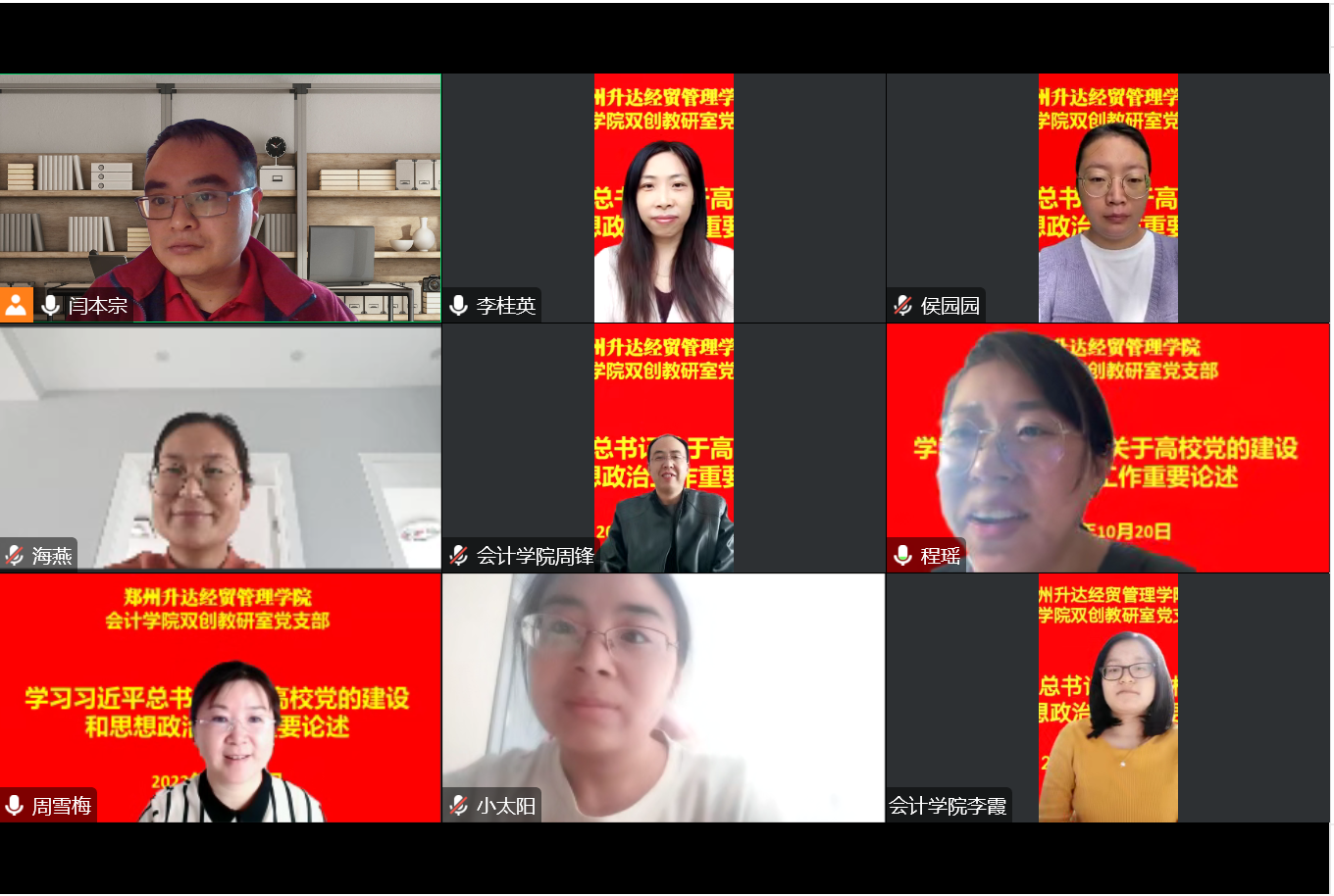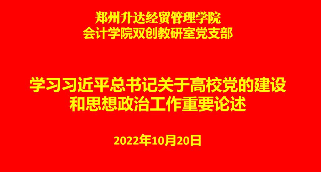 为进一步深入学习习近平总书记关于高校党的建设和思想政治工作重要论述,2022年10月20日,会计学院双创教研室党支部通过腾讯会议开展线上政治学习,党支部全体党员及教研室所有老师一同参加。会议由双创教研室党支部支部书记闫本宗主持。