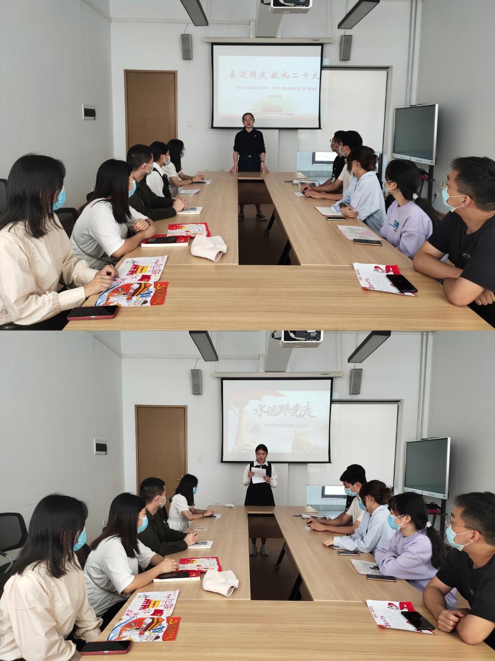 为深入贯彻习近平新时代中国特色社会主义思想,庆祝中华人民共和国成立73周年,迎接党的二十大召开,激发全体师生党员爱党、爱国、爱社会主义的热情,会计学院会计学专业本科第一党支部于9月29日12:30在教学4号楼214会议室开展“喜迎国庆 献礼二十大”主题党日活动。本次活动由党支部书记刘爽老师主持,党支部全体党员参加。