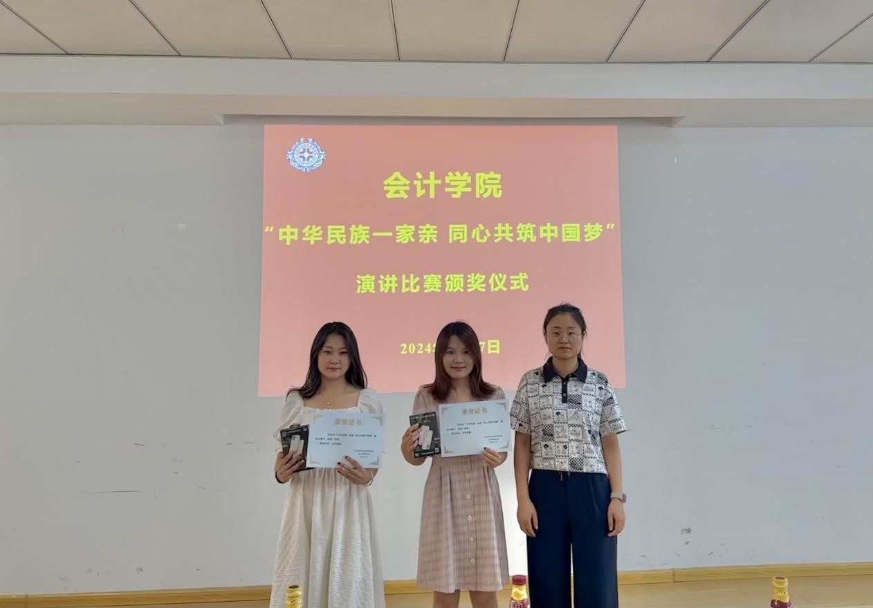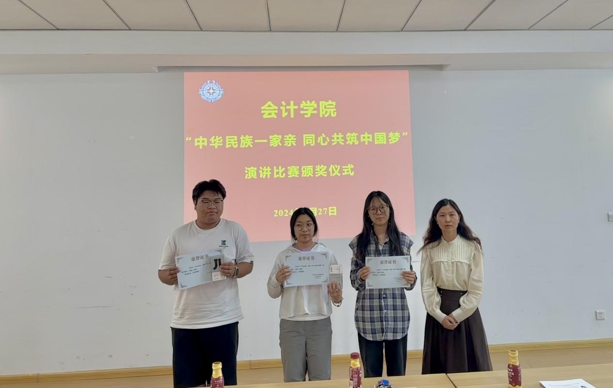 为深入学习贯彻习近平总书记关于加强和改进民族工作的重要思想,促进会计学院师生进一步“铸牢中华民族共同体意识”,我院于2024年5月27日在教学4号楼209会议室举行“中华民族一家亲 同心共筑中国梦”主题演讲比赛。出席本次比赛的嘉宾有行政秘书兼团委书记陈刚、院党委组织委员曹会美,担任本次比赛的评委有统战委员陈姣、统战专员姜早阳、工会副主席许震及社联理事长王赛迪。