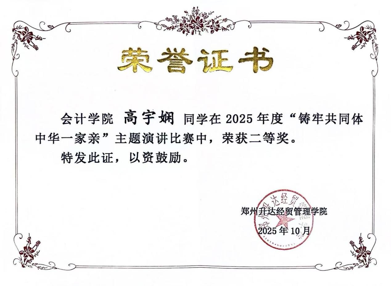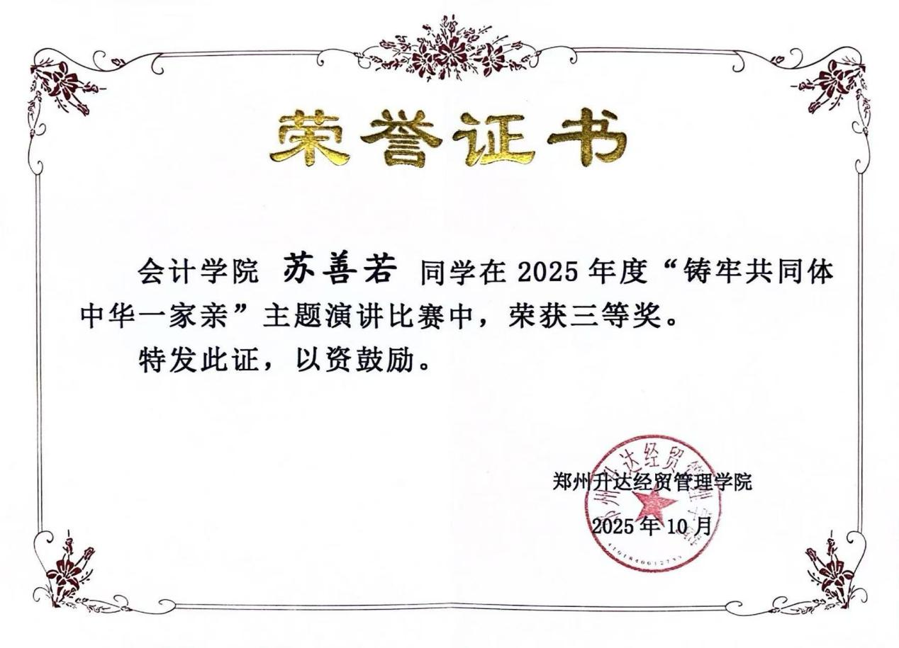 祝贺会计学院高宇娴、苏善若同学在学校举办的2025年度“铸牢共同体中华一家亲”主题演讲比赛中,分别获得二等奖、三等奖。