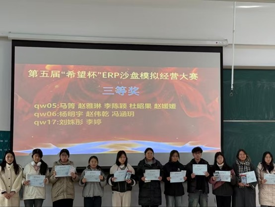 为培养学生的专业能力和综合素质,提升会计学子理论联系实践的能力,11月29日,由会计学院团委主办,会计学院ERP沙盘协会承办的第五届“希望杯”ERP沙盘模拟经营大赛在商管楼312教室举办,并于12月3日在教学四号楼118教室举办了颁奖仪式。参与此次颁奖仪式的嘉宾有会计学院党委副书记兼团委书记陈刚老师,会计学院团委副书记胡淑娟老师,ERP沙盘协会指导老师崔杰老师,社团管理中心主任孙翱以及社团管理中心副主任王莹。