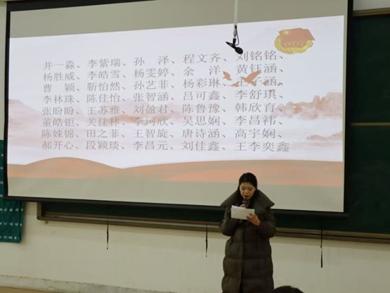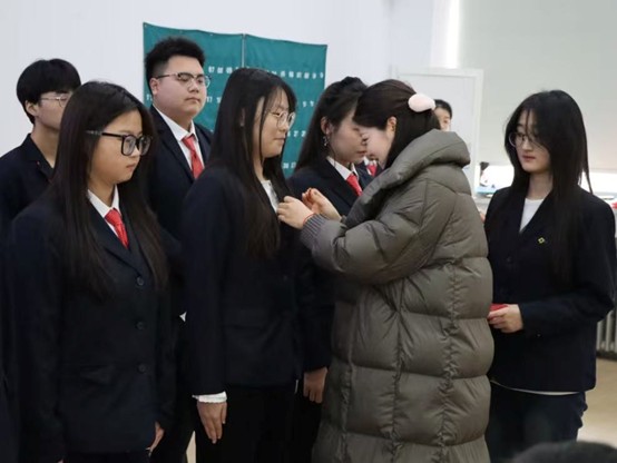 仪式在庄严的国歌中拉开帷幕,激昂的旋律响彻全场,在场每一位师生都神情肃穆,满怀敬意。随后,董婉婉老师宣读新团员人员名单。宣读完毕后,刘瑞雯老师和董婉婉老师为新团员郑重佩戴团徽。一枚枚闪亮的团徽镌刻着责任与担当,佩戴在胸前,更是将共青团的使命深深印刻在每一位新团员心中。