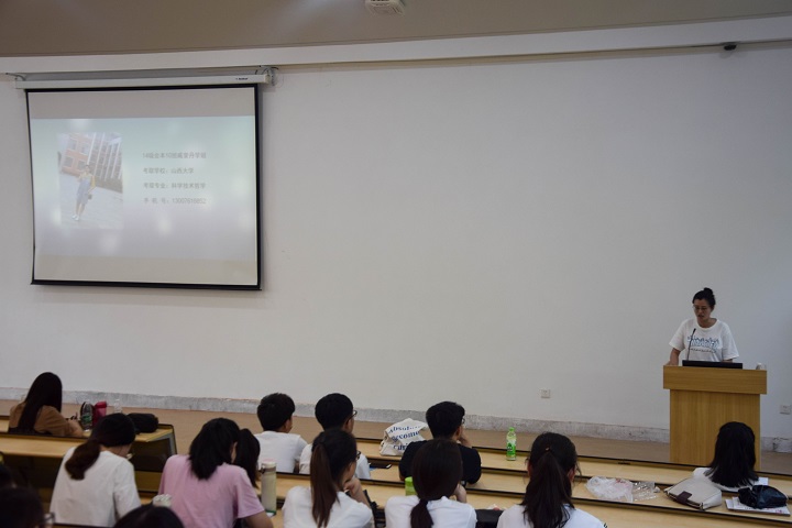 会议在主持人的简单介绍下拉开帷幕。首先由学长学姐们向同学们分享考研经验、考证方法、学习技巧。他们从如何选择一个适合自己的学校到如何去备考,包括最后的复试经验,都毫不吝啬一一给大家分享,现场掌声不断。