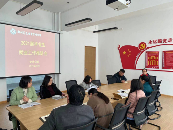 3月22日下午14:00时,会计学院在4号楼116会议室召开2021届毕业生就业工作推进会,出席会议的有会计学院党总支书记张蕾同志、行政秘书兼团委书记陈刚老师、21届就业专员鲁玲玉老师、王岩峰老师以及21届全体毕业班辅导员。会议对上学期2021届的就业工作进行了总结,并对本学期的就业工作进行了全面部署。
