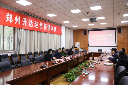 11月18日,郑州经贸学院科技处处长张雪松、艺术学院院长牛玖荣、商学院院长闫丽霞、综合科科长刘洁四人莅临我校考察调研,我校张金安副校长、商学院白朋飞副院长、艺术学院赵维平副院长、科研处同仁与来宾在行政楼第二会议室举行座谈会,座谈会由张金安副校长主持。