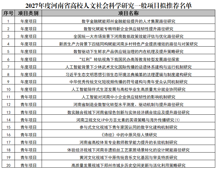 根据河南省教育厅办公室下发《关于2027年度河南省高校人文社会科学研究一般项目申报工作的通知》(教办社语〔2026〕29号)文件和《郑州升达经贸管理学院科研项目推荐办法》文件相关要求和申报程序,经个人申报,形式审查、学院评审推荐,结合2025年各学院立项比例,现拟推荐20项课题报送河南省教育厅,其中青年项目比例达50%,公示时间为3月19日-3月21日。公示期内,若对拟推荐项目有异议,请以书面形式实名向科研处反映。
