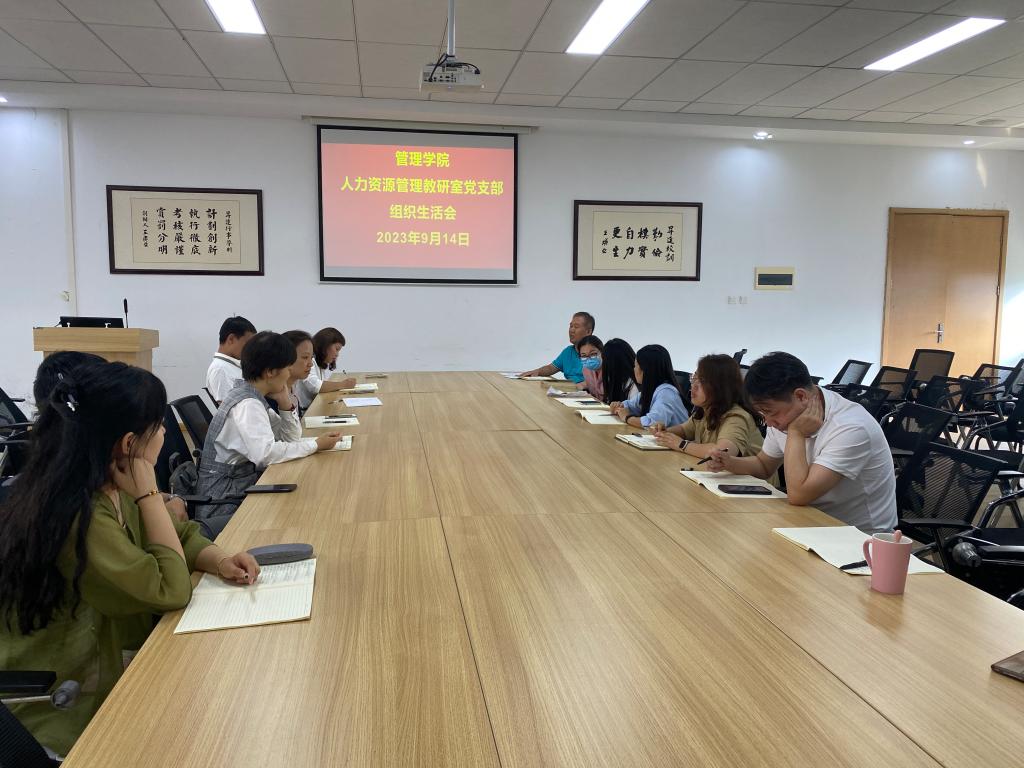 管理学院人力资源管理教研室党支部于2023年9月14日下午在2号楼208召开学习贯彻习近平新时代中国特色社会主义思想专题组织生活会。本次会议由支部书记李玲玲同志主持,学院党委书记职正路同志及支部全体成员共16人参加。