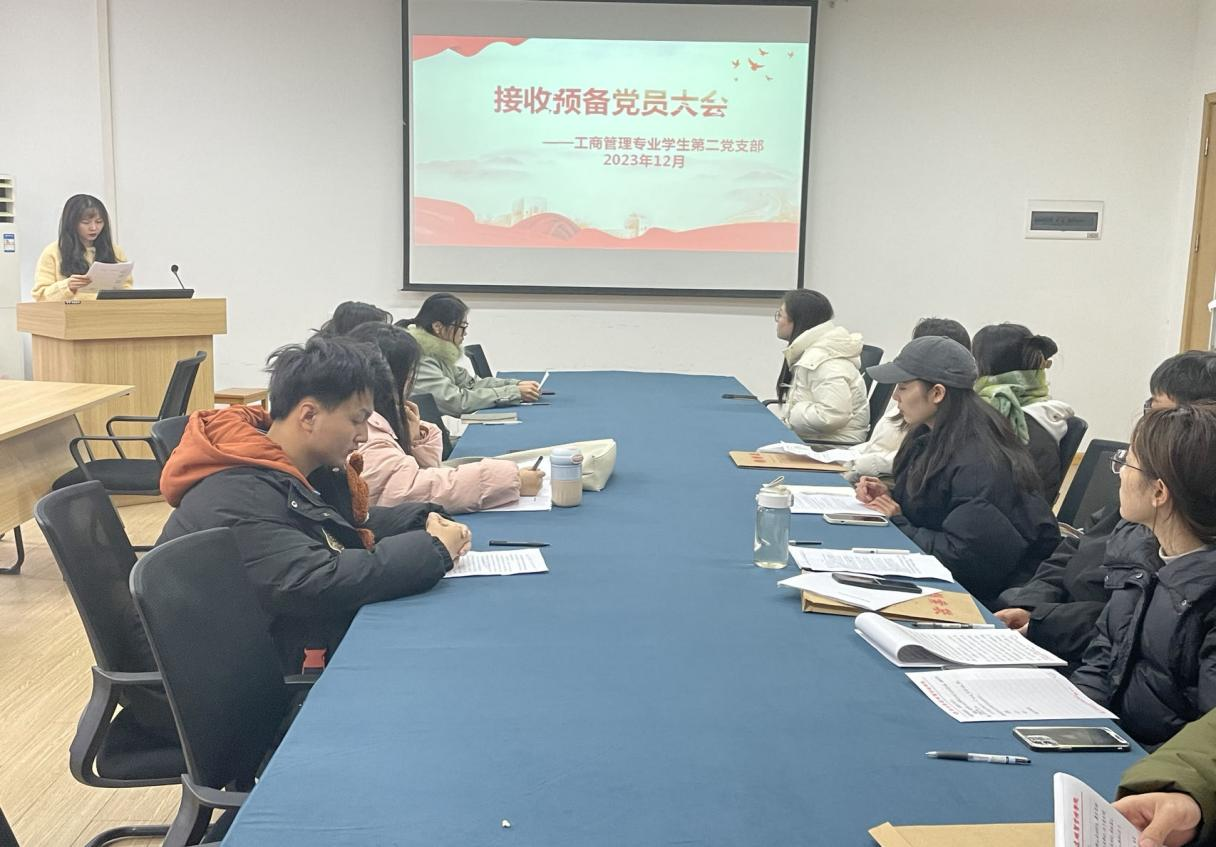 2023年11月30日,管理学院工商管理专业学生第二党支部在二号楼305召开预备党员接收大会,本次会议由线下举行。会议由管理学院工商管理专业学生第二党支部支部书记张瑞霞老师以及支部全体成员参加此次会议。