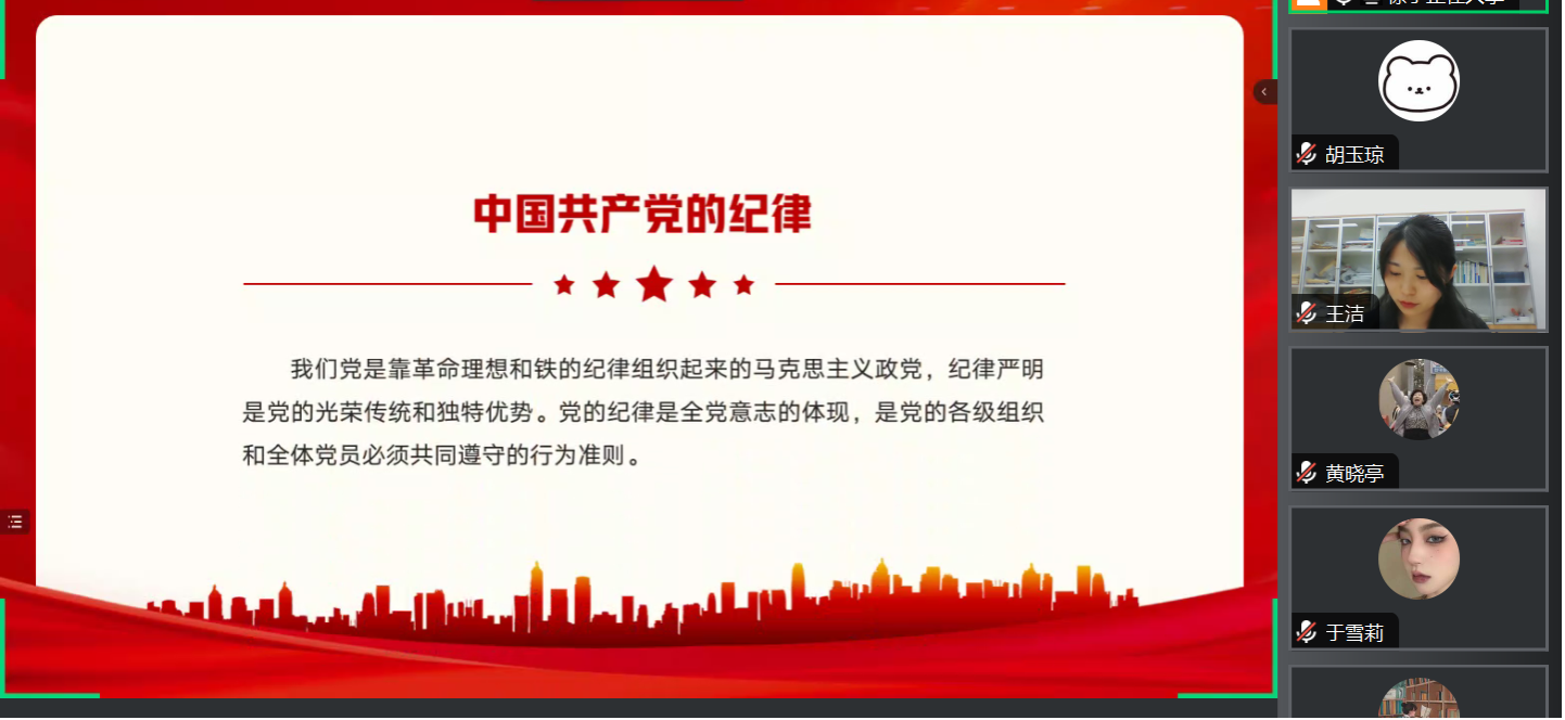 活动开始,王洁同志首先向全体党员强调党纪学习教育的重要性,阐述了加强党纪学习的必要性和紧迫性,进一步明确了学校和学院党委对党纪学习教育工作的部署和要求。随后,由组织委员徐宁同志带领全体党员逐条学习《中国共产党纪律处分条例》。通过此次主题党日活动,加深了党员对党规党纪的理解和认识,明确了遵守党纪的重要性,也增强了支部党员学纪知纪的纪律意识。