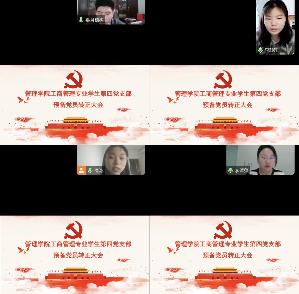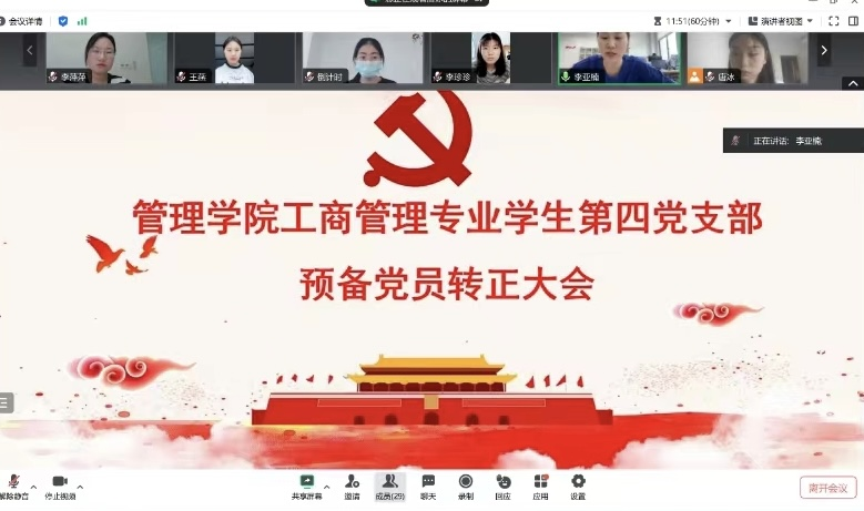 为进一步规范党员的发展流程,加强党员党性修养和素质水平。管理学院工商管理专业学生第四党支部于2024年5月10日12:30在腾讯会议召开第十七期预备党员转正大会,支部全体党员参加了本次会议,会议由支部书记李亚楠同志主持。