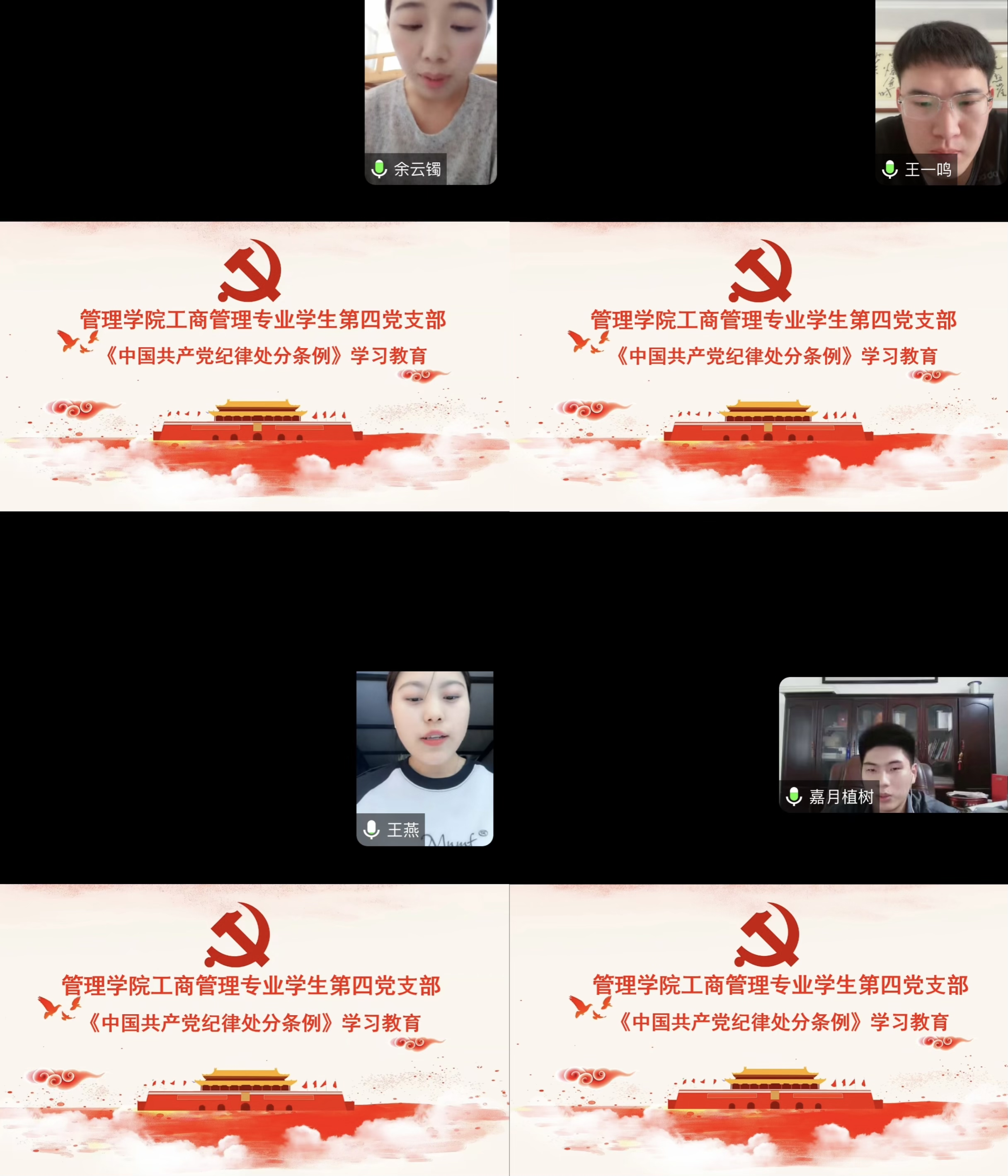为加强学生党员党纪学习教育,管理学院工商管理专业学生第四党支部于5月30日1点在腾讯会议召开《中国共产党纪律处分条例》学习教育。该活动由支部书记李亚楠同志主持,管理学院党委副书记、院长朱影影同志受邀出席,支部全体党员参加了本次活动。