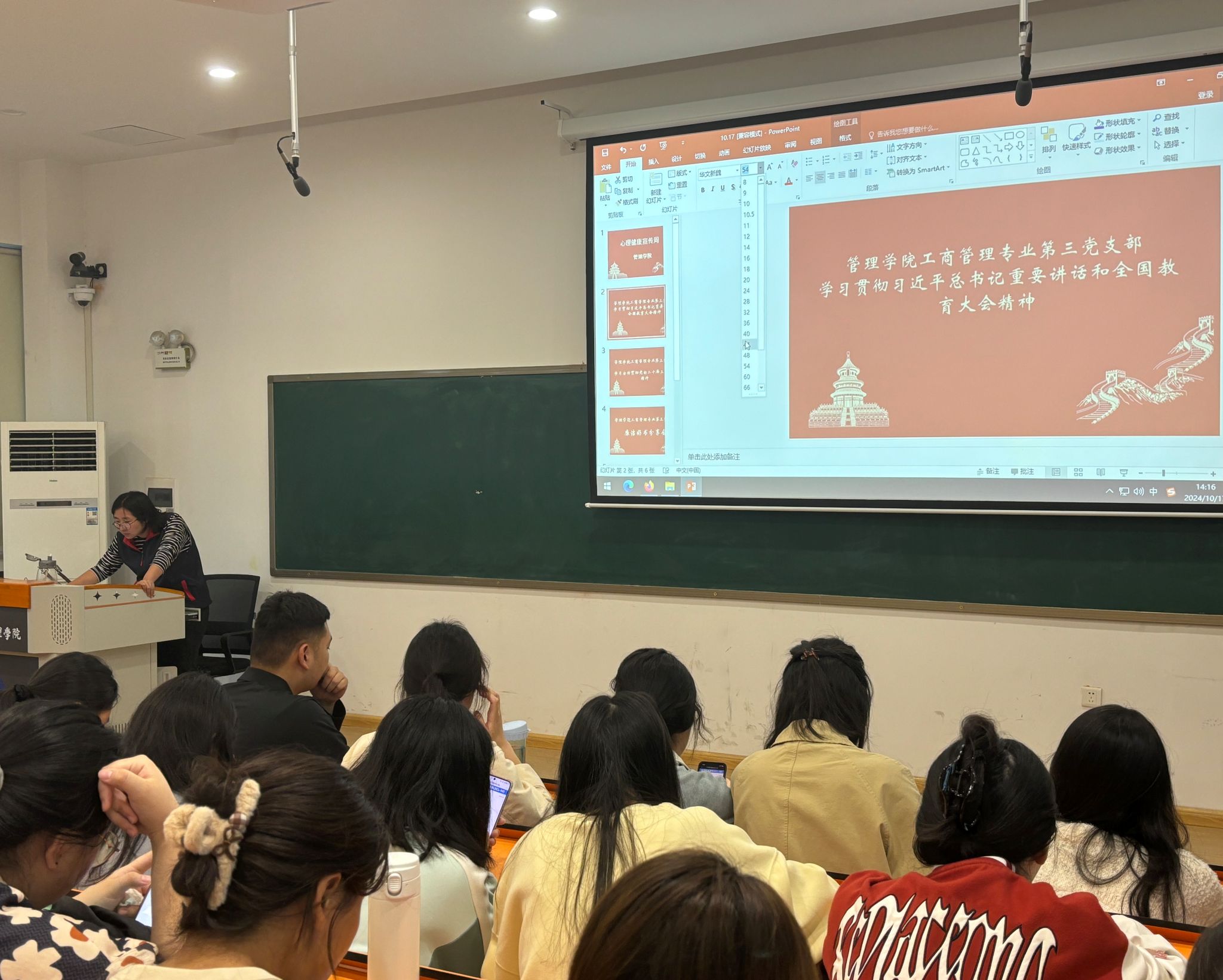 为深入学习贯彻习近平总书记在全国教育大会上的重要讲话精神,管理学院工商管理专业学生第三党支部于2024年10月17日下午2:00在教学二号楼208统一学习了此次会议精神。