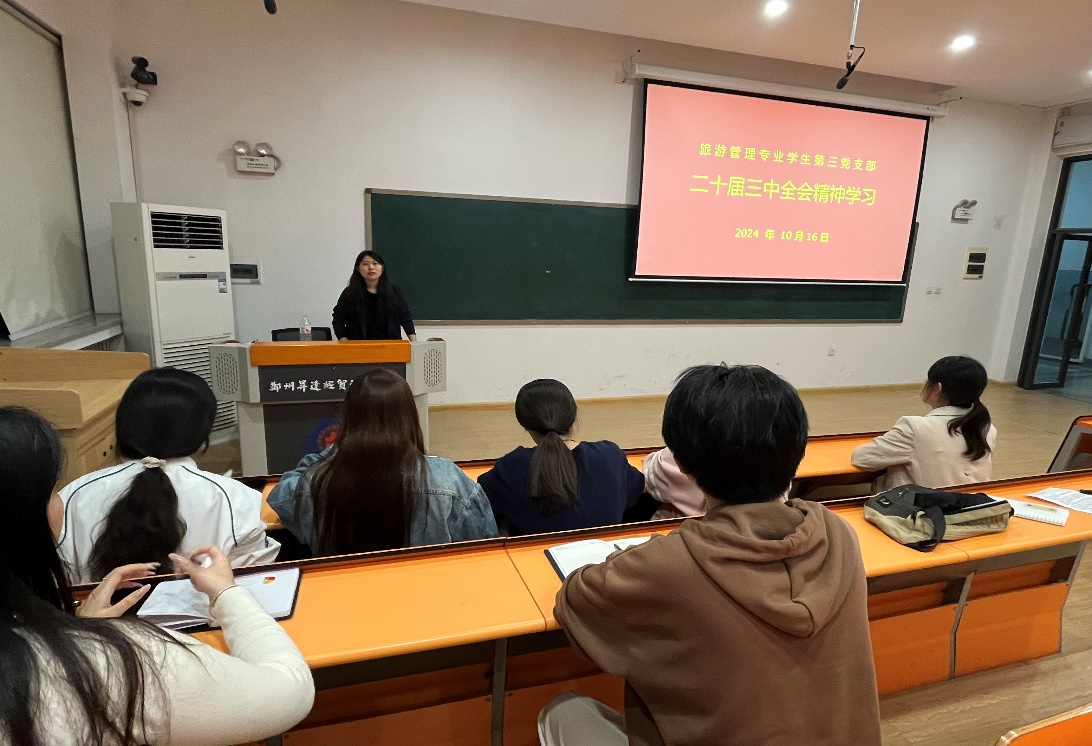 为深入学习贯彻党的二十届三中全会精神,推动学生党员深刻理解和把握党的二十届三中全会的精神实质,提高学生党性修养。10月16日下午,管理学院旅游管理专业学生第三党支部在2号楼208教室组织全体党员共同深入学习领会党的二十届三中全会精神。此次会议由支部书记王洁同志主持。
