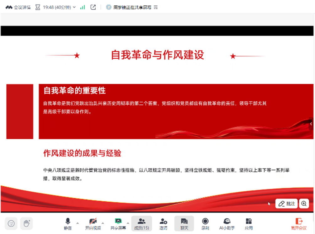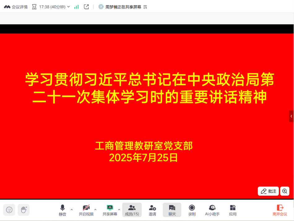 为深入学习贯彻习近平新时代中国特色社会主义思想,加强党支部建设,提升党员教师的政治素养,2025年7月25日,工商管理教研室党支部采取线上会议的形式开展了主题党日活动,集中学习习近平总书记在中央政治局第二十一次集体学习时的重要讲话精神。此次活动由工商管理教研室党支部书记董芳芳主持,全体党员教师积极参与。