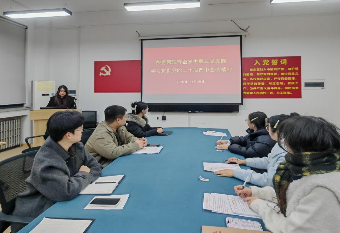 为深入学习贯彻党的二十届四中全会精神,准确把握“十五五”规划的宏伟蓝图,11月27日下午,旅游管理专业学生第三党支部在2号楼305会议室组织学习贯彻党的二十届四中全会精神。此次会议由党支部书记王洁主持,支部全体党员参加会议。