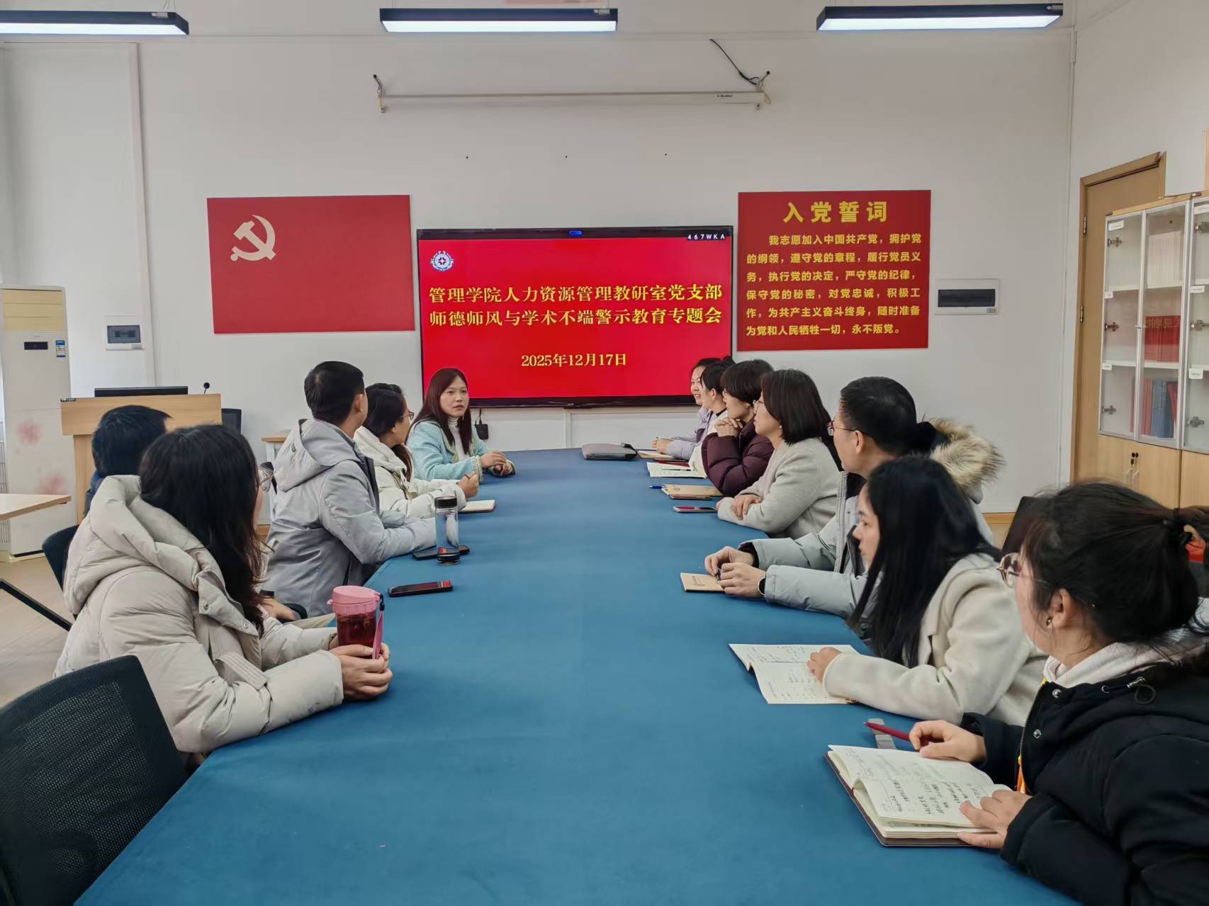 为深入学习贯彻新时代教师职业行为准则,进一步加强师资队伍思想政治与职业道德建设,筑牢学术道德底线,2025年12月18日下午,管理学院人力资源教研室党支部在教学2号楼305室组织开展了“筑牢师德根基,严守学术规范”专题警示教育活动。党支部全体党员教师参加了本次活动。