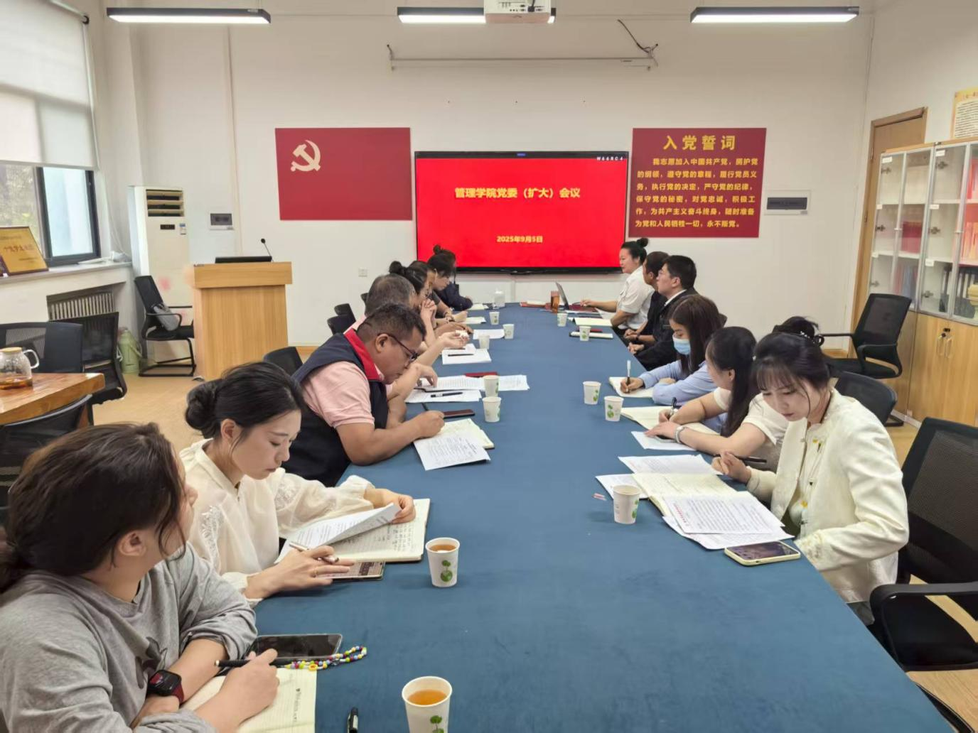 2025年9月5日上午,管理学院党委在教学2号楼305会议室召开扩大会议。管理学院党委书记职正路,党委副书记、院长朱影影,党委副书记许广庆和全体党委委员参加会议,各党支部书记列席会议。会议由职正路主持。