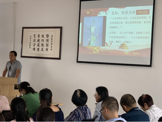 2019年9月26日13:40时,在2号教学楼209会议室全体教职工进行了第四场“清风话廉”主题教育,即“据鱼是标、拒欲为本”的廉洁故事。