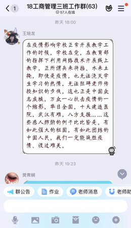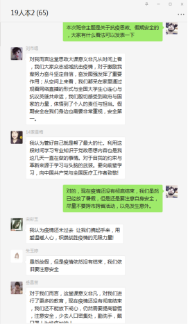 19人力资源管理本科2班刘市唱说:“对我而言这堂思政第一课意义非凡,从时间上看,我们大家众志成城抗击疫情,对于激励我辈努力奋斗坚定自信,奋发图强发挥了重要作用;从空间上来看,我们都呆在家里通过观看视频的形式与全班同学心连心,与抗疫英雄共命运,我们殷切感受到政府与国家的力量,体悟到了个人的责任与担当。假期安全在我们身边也需要非常重视,安全第一。我们要同舟共济,齐心协力,以实际行动为抗疫决战履职尽责!”