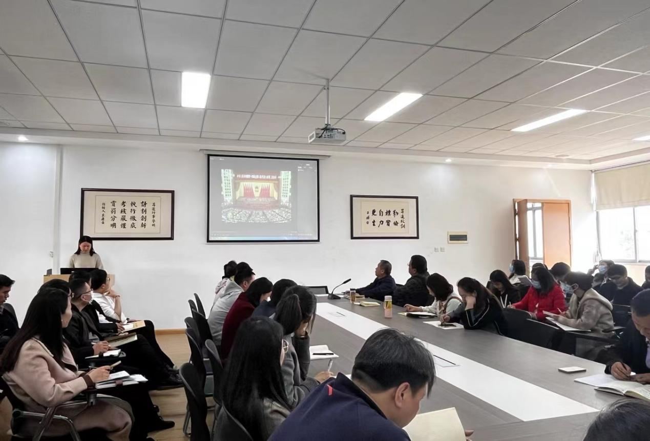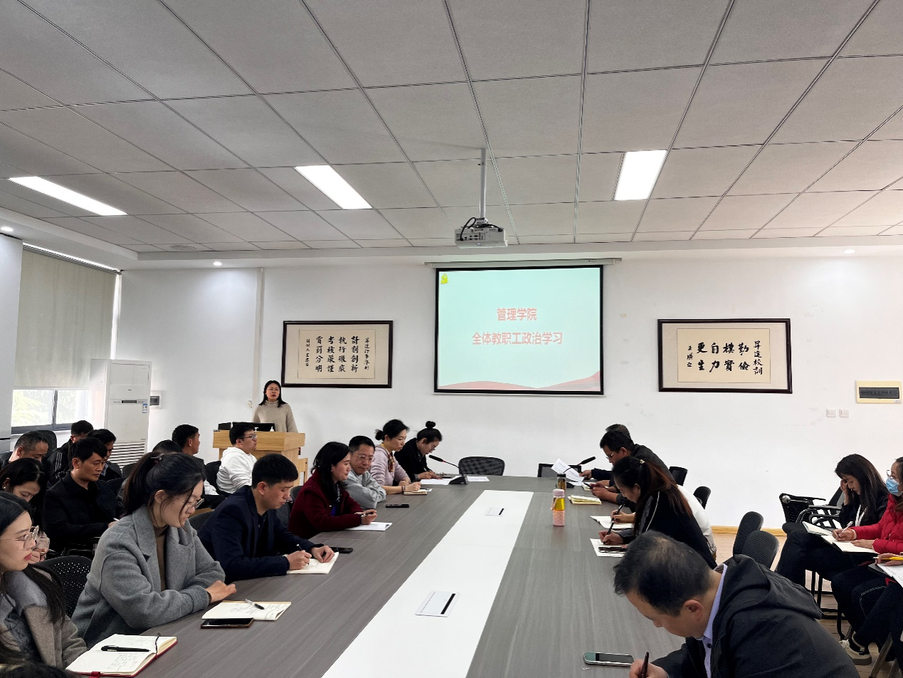 3月21日下午,管理学院组织全体教职工集中开展政治学习,学习贯彻全国两会精神,凝聚发展共识。学院党委书记职正路主持会议。