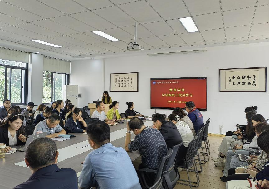 10月9日下午,管理学院组织全体教职工集中开展政治学习,深入学习领会习近平总书记在庆祝中华人民共和国成立75周年招待会上的重要讲话精神。学院党委书记职正路主持会议。会议指出,习近平总书记的重要讲话深刻总结了75年来我们党团结带领全国各族人民取得的伟大成就,并重申了以中国式现代化全面推进强国建设、民族复兴的中心任务。习近平总书记的重要讲话高屋建瓴、思想深邃,不仅体现了对历史的深刻理解和对未来的坚定信心,也彰显了坚定的历史定力,激励着全国各族人民在实现中华民族伟大复兴的征程上锚定目标,担当作为,奋勇前进。