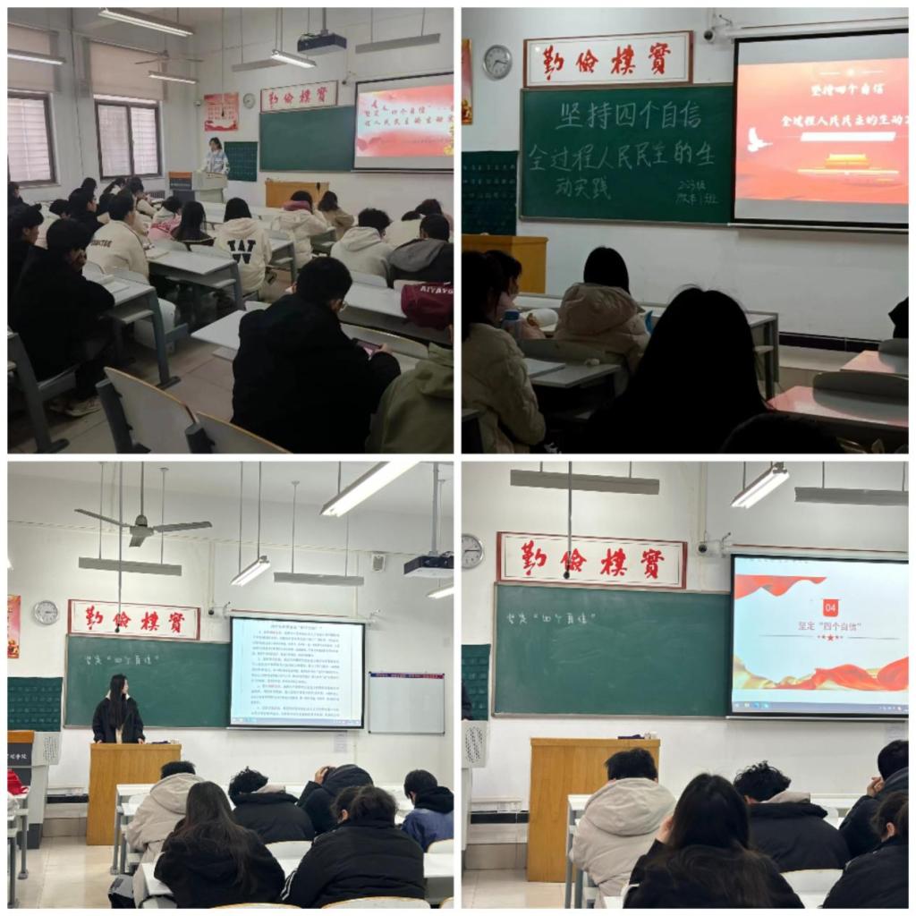 为适应国家发展大势和时代要求,增强“四个自信”,2024年3月10日-11日,管理学院各班级团支部利用课余时间在教学楼举办以“坚持‘四个自信’,做新时代好青年”为主题的团日活动,各班级团支部参与此次活动。