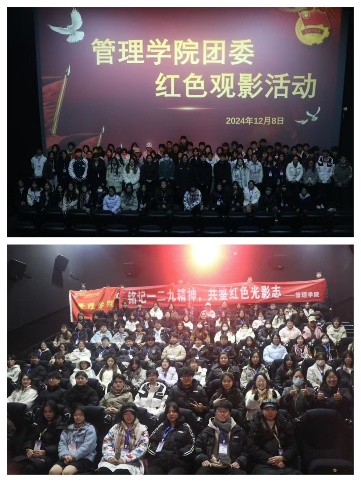 1935年12月9日,北平的数千名大中学生高举抗日救国的旗帜,掀起了一场波澜壮阔的抗日救亡运动,这就是著名的一二·九运动。为赓续一二·九爱国精神,传承先辈品质,激励新时代担当、铭记历史,增强爱国情怀与集体凝聚力,展现青春风采与责任担当。管理学院于2024年12月8日举办“铭记一二九精神,共鉴红色光影志”红色观影活动。参加本次观影活动的人员:管理学院团委学生会全体同学。