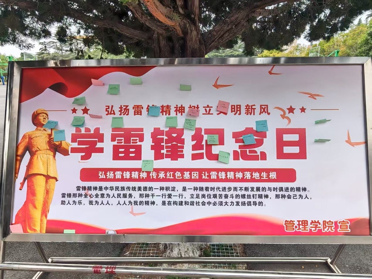 为弘扬雷锋精神,加强学院精神文明建设,管理学院于2025年3月27至28日在明德广场举办以“雷锋精神传,校园春满园”为主题的雷锋知识竞答活动,活动吸引众多学生参与,现场气氛热烈。