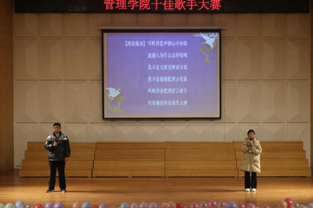 悠悠扬扬,歌声嘹亮,让歌声传遍每一个角落,让青春绽放绚丽的色彩。管理学院于2023年12月14日晚18:30在艺术大楼音乐厅举办十佳歌手大赛决赛。出席本次大赛的嘉宾有:管理学院新生辅导员马超老师、祖鹏阳老师,管理学院团委书记助理陈钰卓、闫家晖,团委副书记张开迪,管理学院学生会主席胡聪聪,学生会副主席徐子涵、张一博、曹智锋,党建工作中心主任武格格以及2023级部分学生。