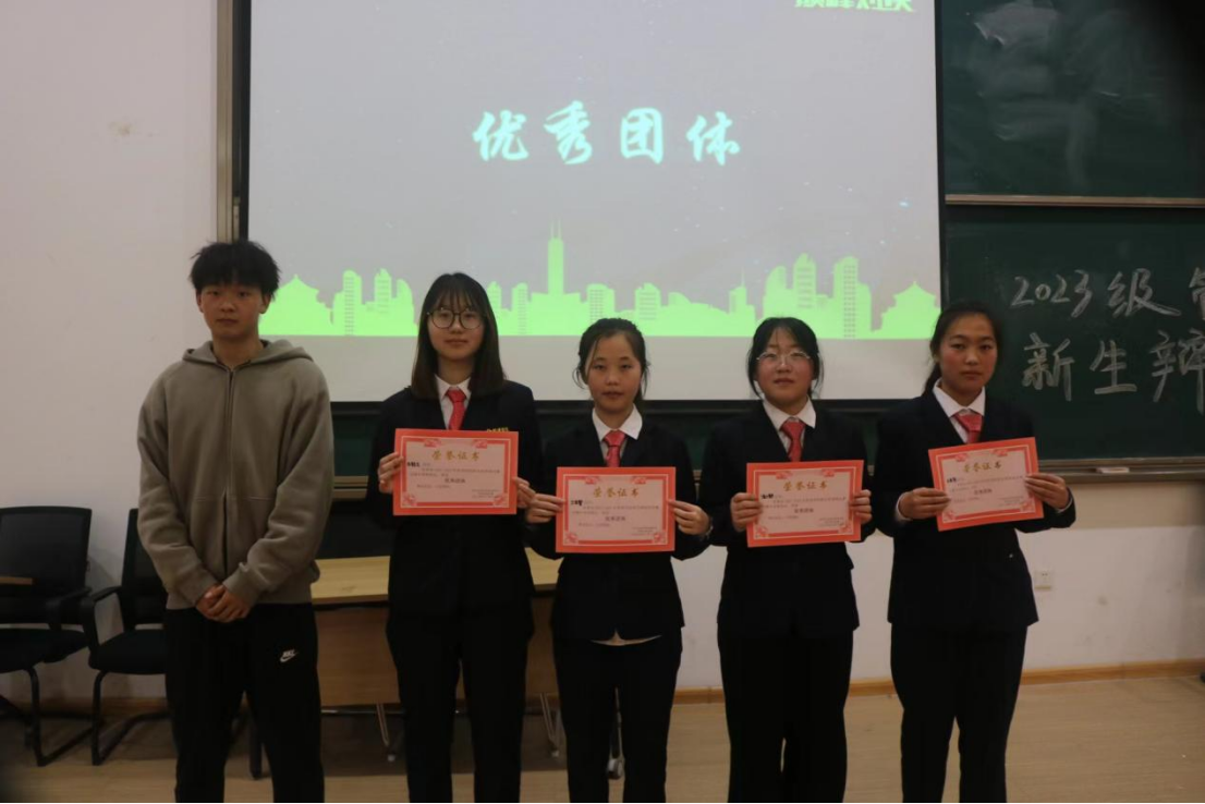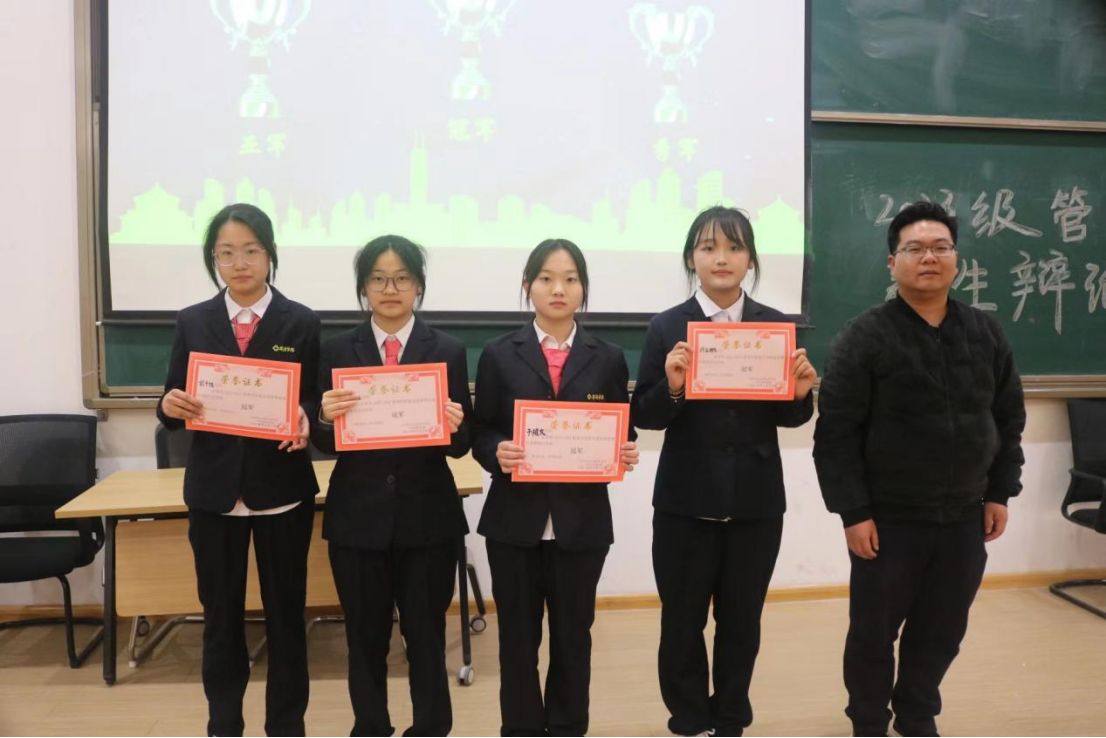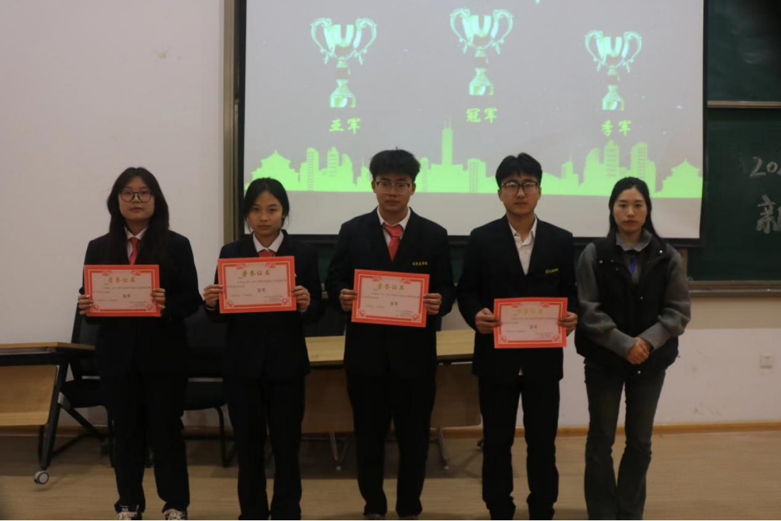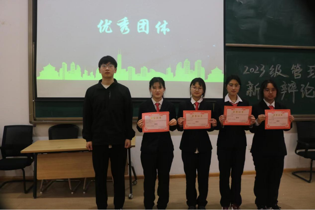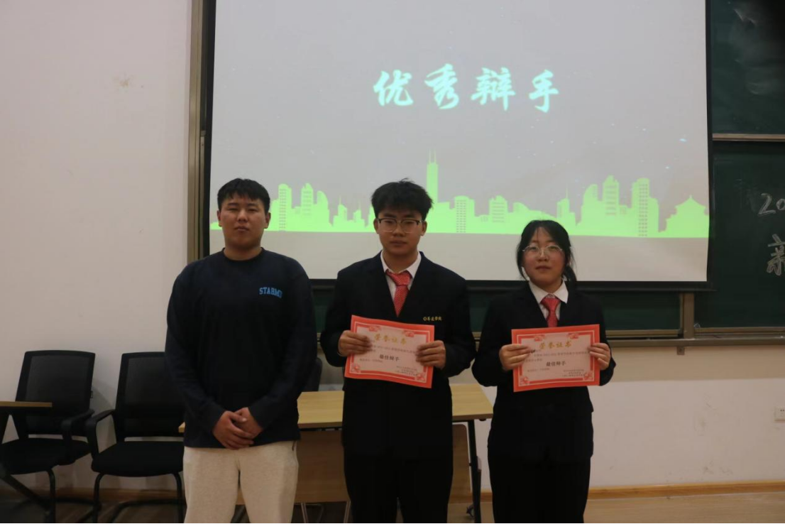 决赛接近尾声,由评委老师评选出优秀团体以及最佳辩手。主持人公布获奖名单,获得本场比赛最佳辩手的是武子旭、朱靓芸,由曹智锋学长为他们颁奖并合影留念;获得优秀团体奖的是23工商管理本科2班,由闫家晖学长为他们颁奖并合影留念;获得本场比赛季军的是23旅游管理本科1班,由胡聪聪学长为他们颁奖并合影留念;获得本场比赛亚军的是23人力资源管理本科1班,由祖鹏阳老师为他们颁奖并合影留念;获得本场比赛冠军的是23旅游管理本科1班,由马超老师为他们颁奖并合影留念。最后主持人宣布本次活动圆满结束。