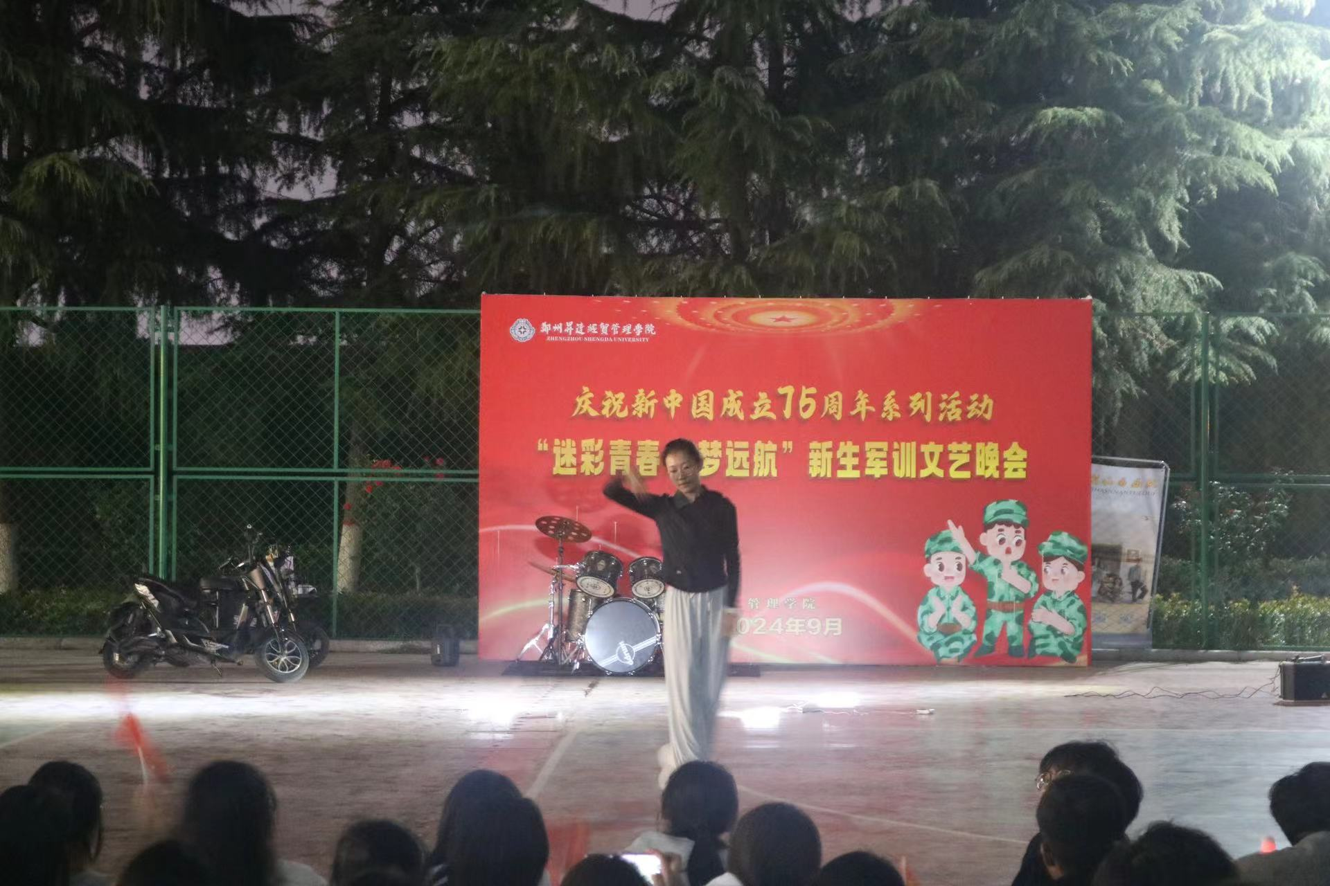紫荆山乐队为我们带来歌曲《曹操》、《new boy》、《娜拉》(原创)等歌曲,乐器的演奏更是为这场表演增添了别样的色彩。激昂的鼓点像是军训时的阵阵鼓号,激励着大家勇往直前;悠扬的吉他声则如清风拂面,驱散了军训的疲惫。文艺部刘子涵演唱的《身骑白马》也活跃了晚会的气氛。
