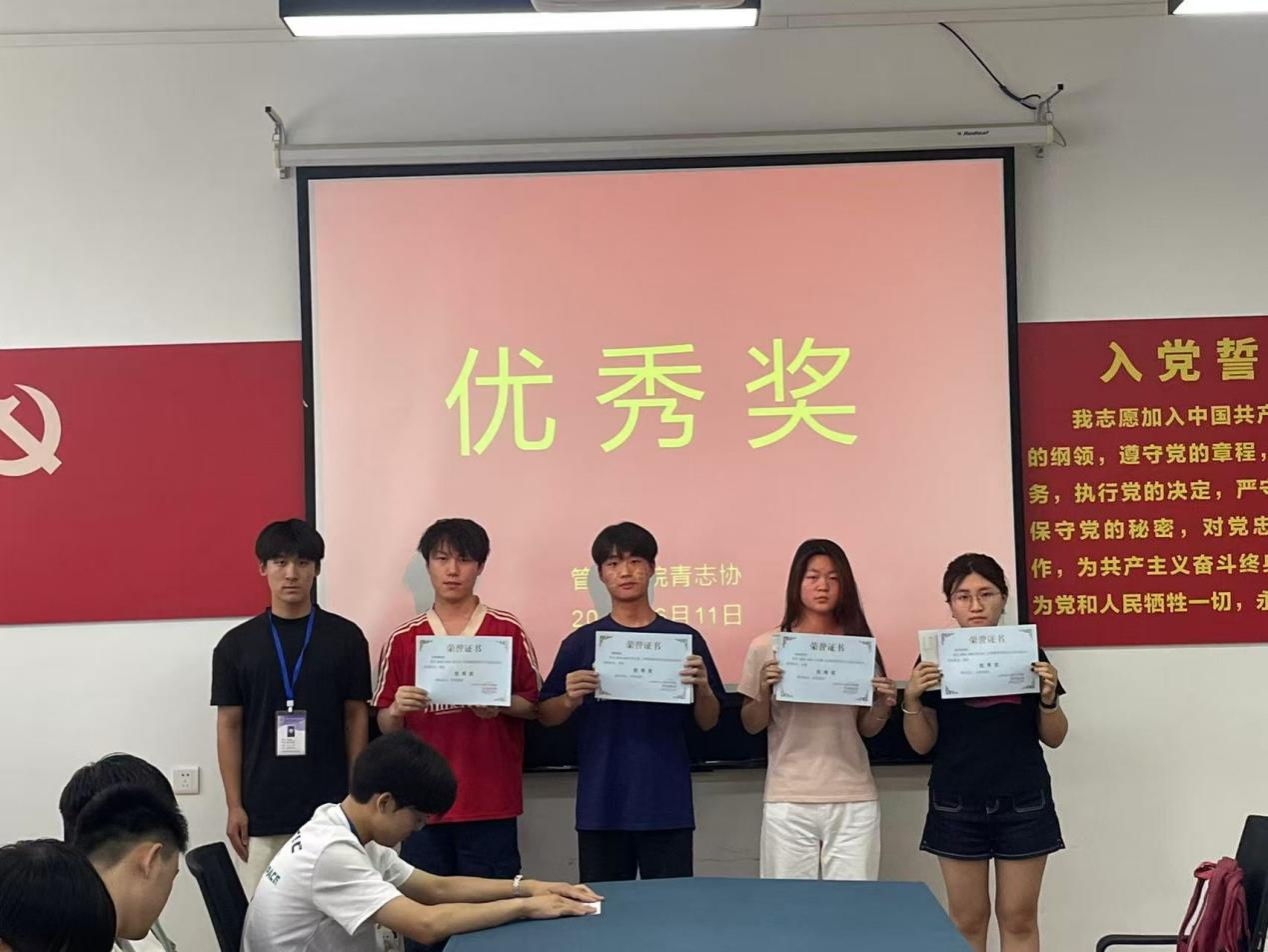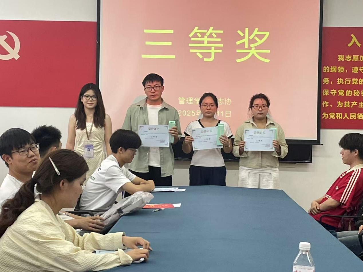 其次由宋笑笑就本次活动宣布获奖名单并进行颁奖活动,以此来表彰管理学院学子百日的坚持与努力。由黄永健为肖于璐同学颁发一等奖,宋小强为李艺博和李恩硕同学颁发二等奖,杨旭为刘怡,王志梁以及朱可新同学颁布三等奖,王俊超为刘飒,张家旗,单诗语以及徐子昕同学颁发优秀奖,颁奖后并与他们进行拍照留念。