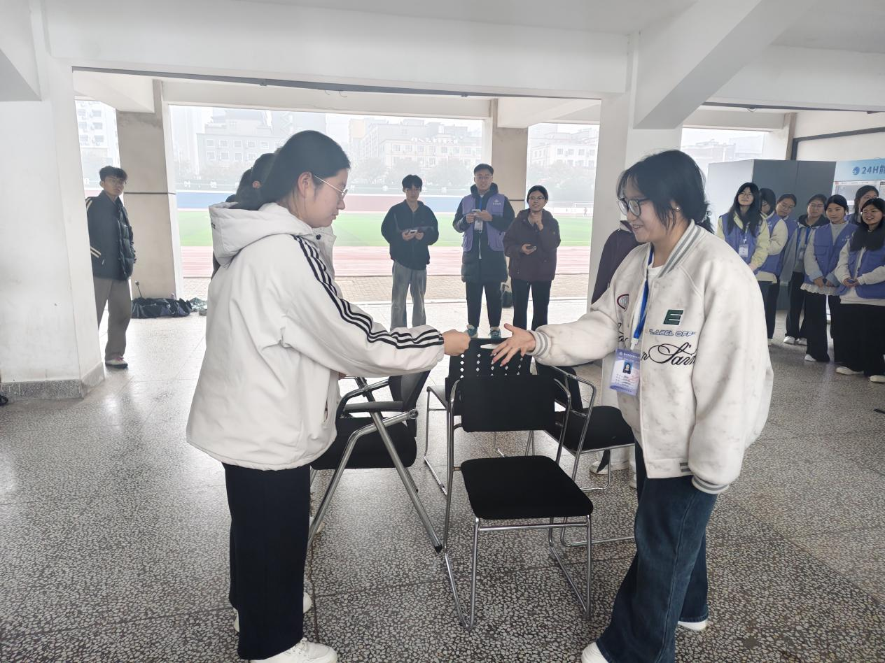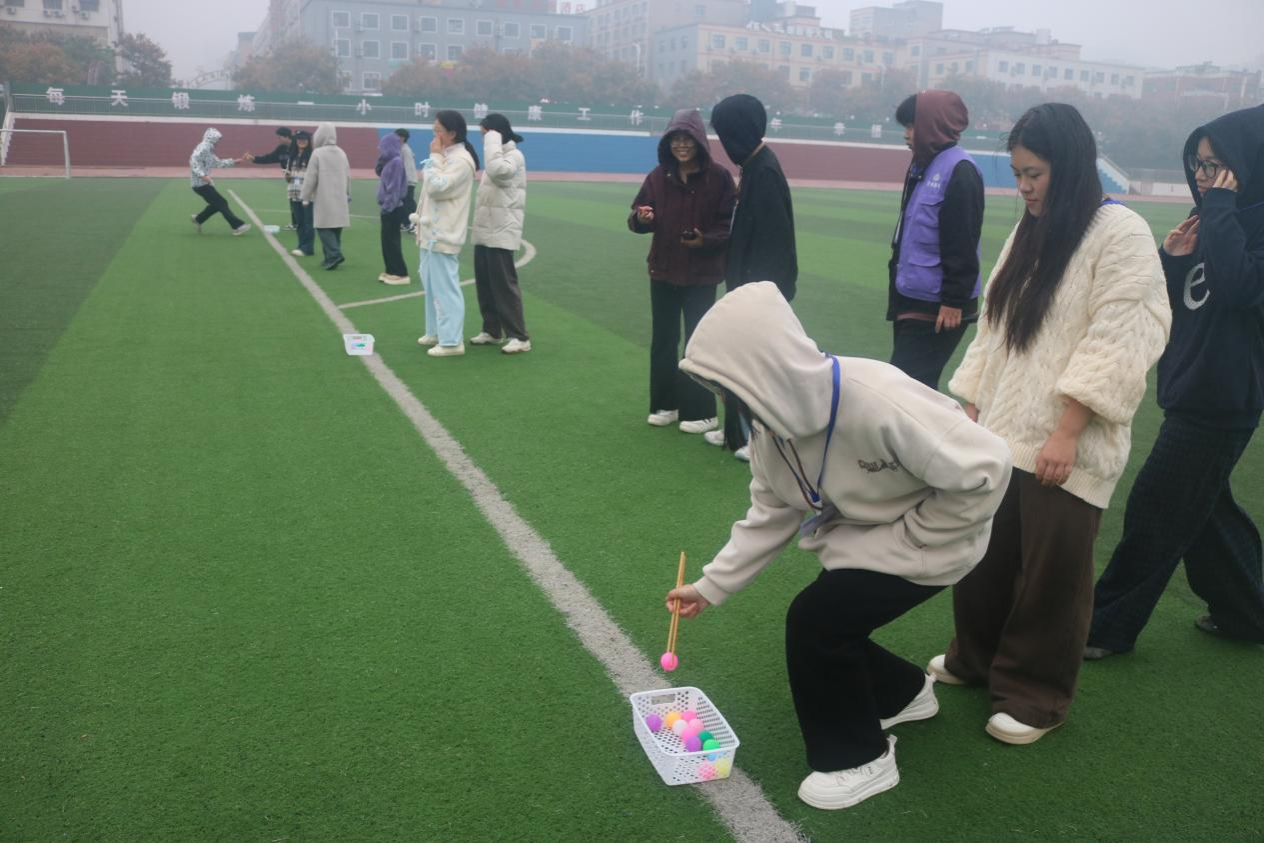 筷子夹球项目也拉开帷幕,彩色的乒乓球被选手们用筷子夹起并运送至操场另一边,过程中球不能落地。这一项目既需要选手胆大心细,又要求稳求快。选手们临危不乱,队友之间相互配合、加油打气,现场氛围热烈。