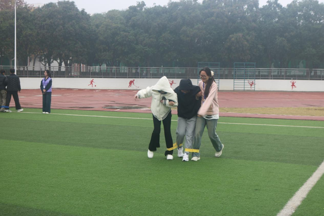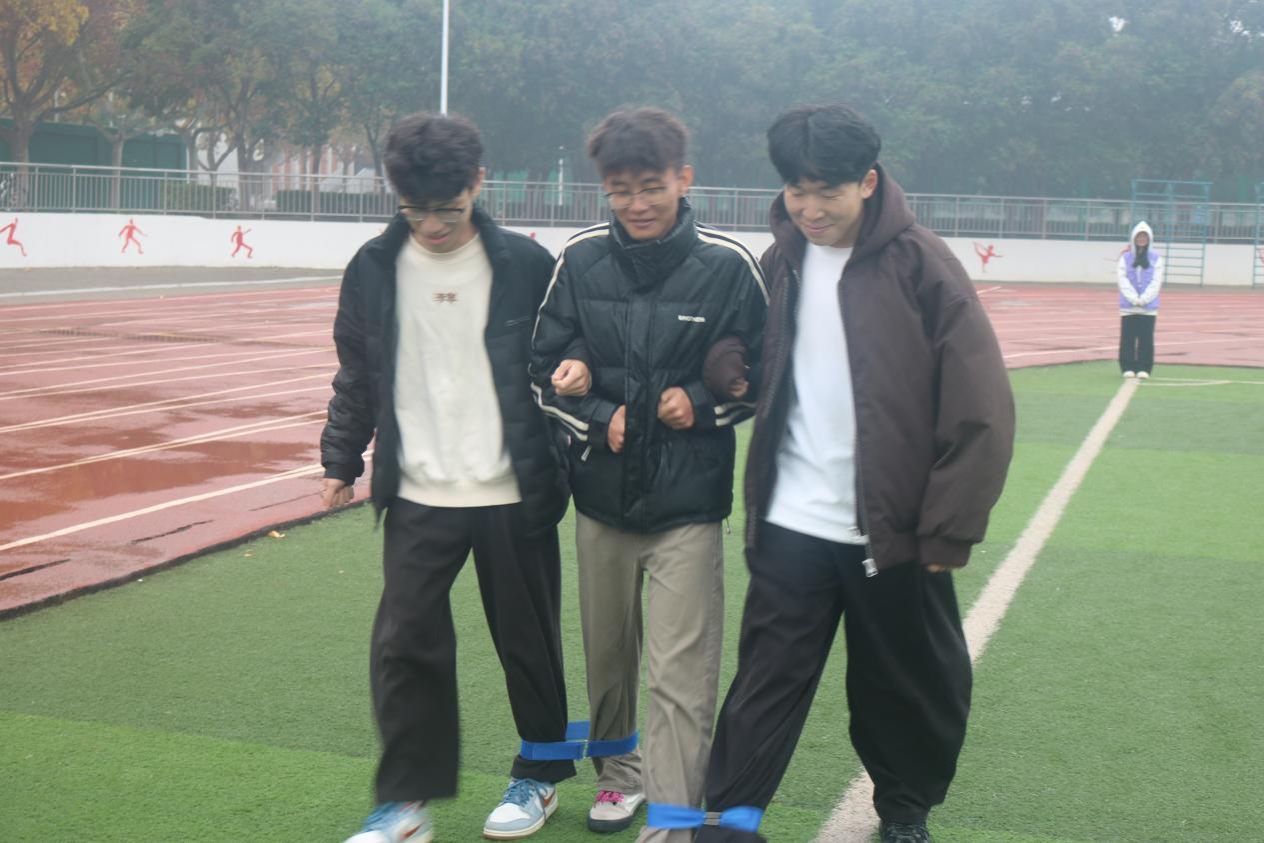 随后进行的三人四足比赛,考验着团队的协作能力。选手们三人一组,将彼此的脚绑在一起,只有同进同退、高效沟通协作才能走得更远。比赛过程激烈,每个小组都全力加快步伐,他们认真的神情、整齐的步伐,成为操场上一道靓丽的风景线。