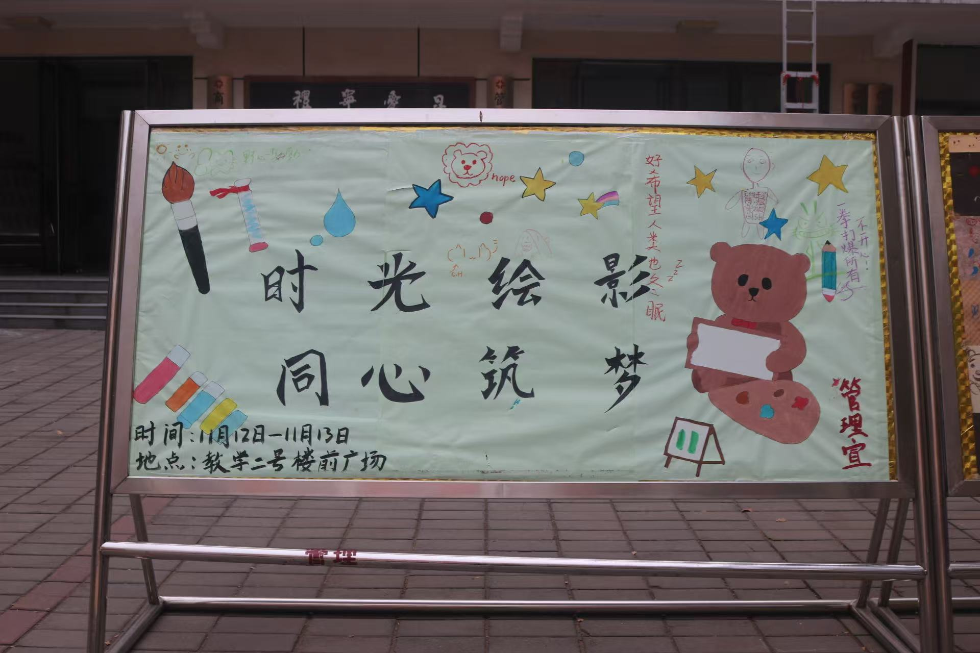 为缓解学习压力、营造暖心氛围,管理学院青年志愿者协会于2025年11月12日在教学2号楼前举办“拾光绘影,同心筑梦”的主题活动。本次活动以“时光记忆”为创作线索,通过集体绘画与温暖寄语,让同学们在艺术与交流中传递情感、凝聚力量。