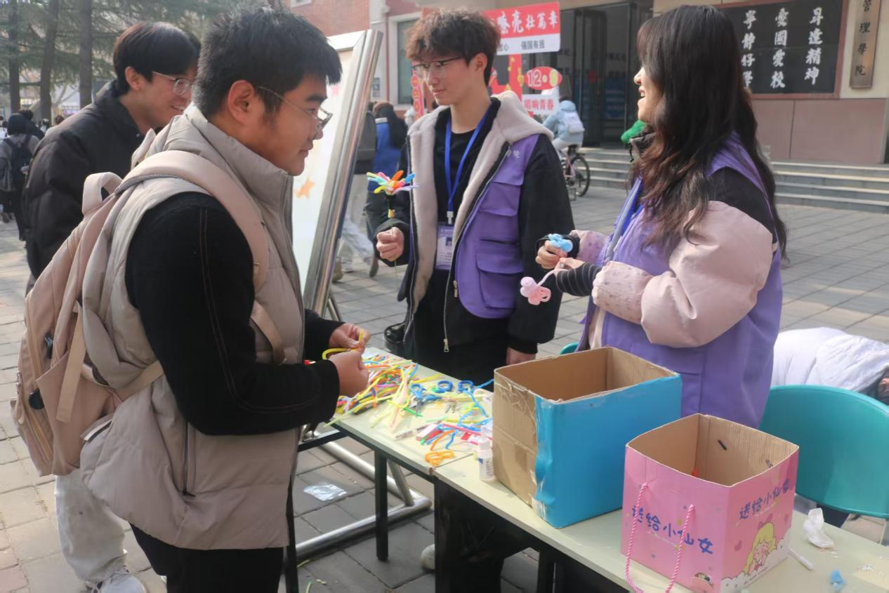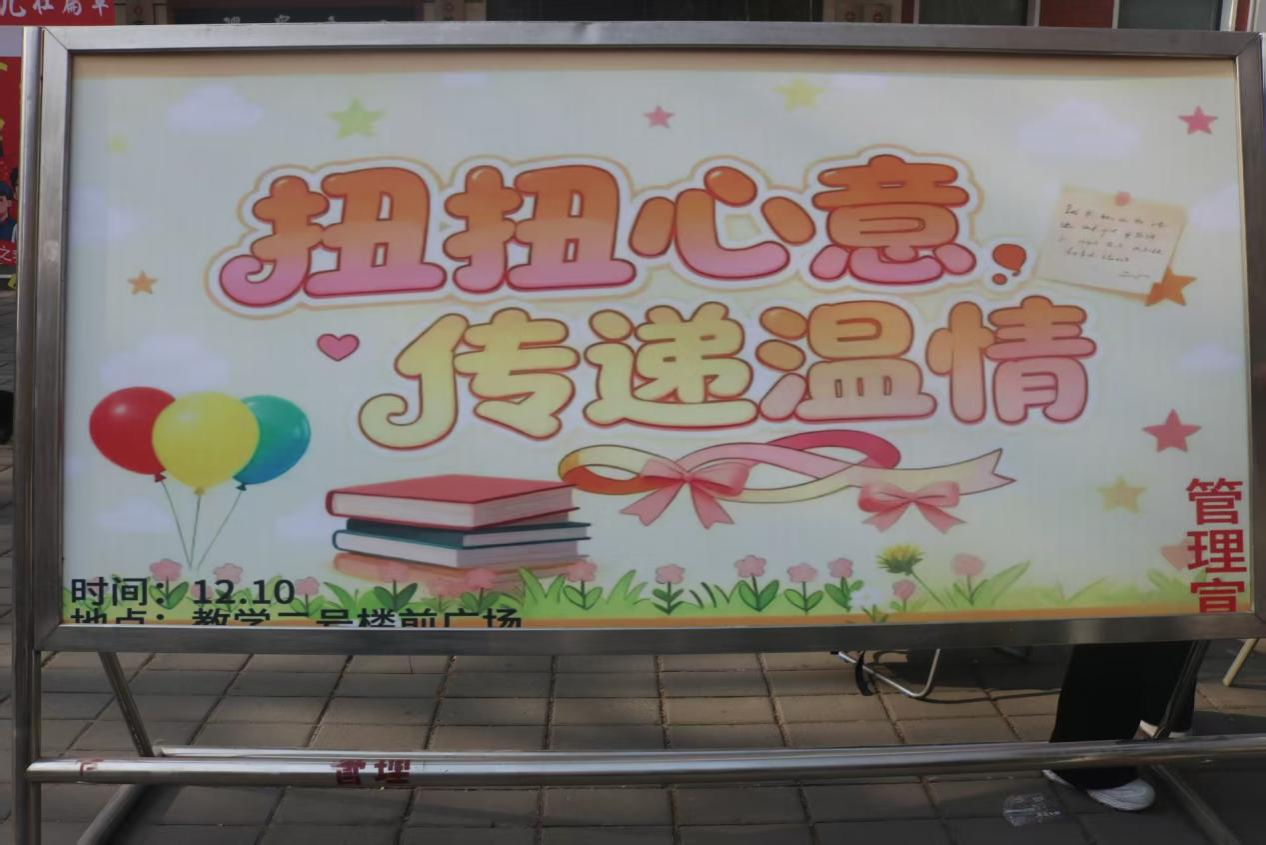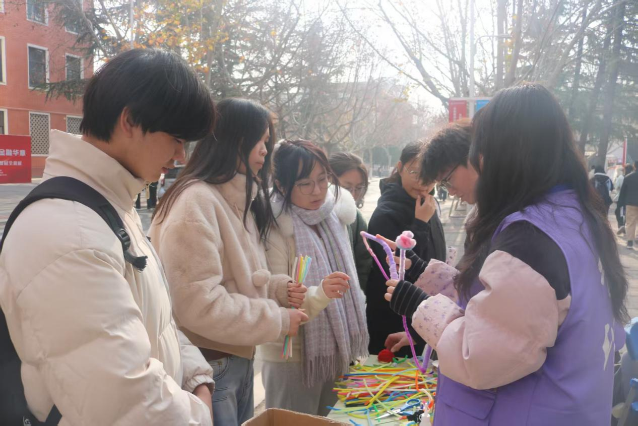 为落实“我为同学做实事”服务理念,丰富校园文化生活,缓解学生学业压力,2025年12月8日,管理学院青年志愿者协会于教学二号楼前举办“扭扭心意,传递温情”主题活动,吸引众多学生积极参与。
