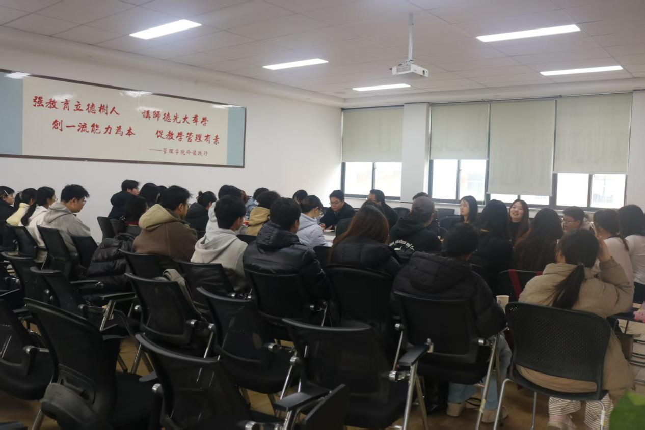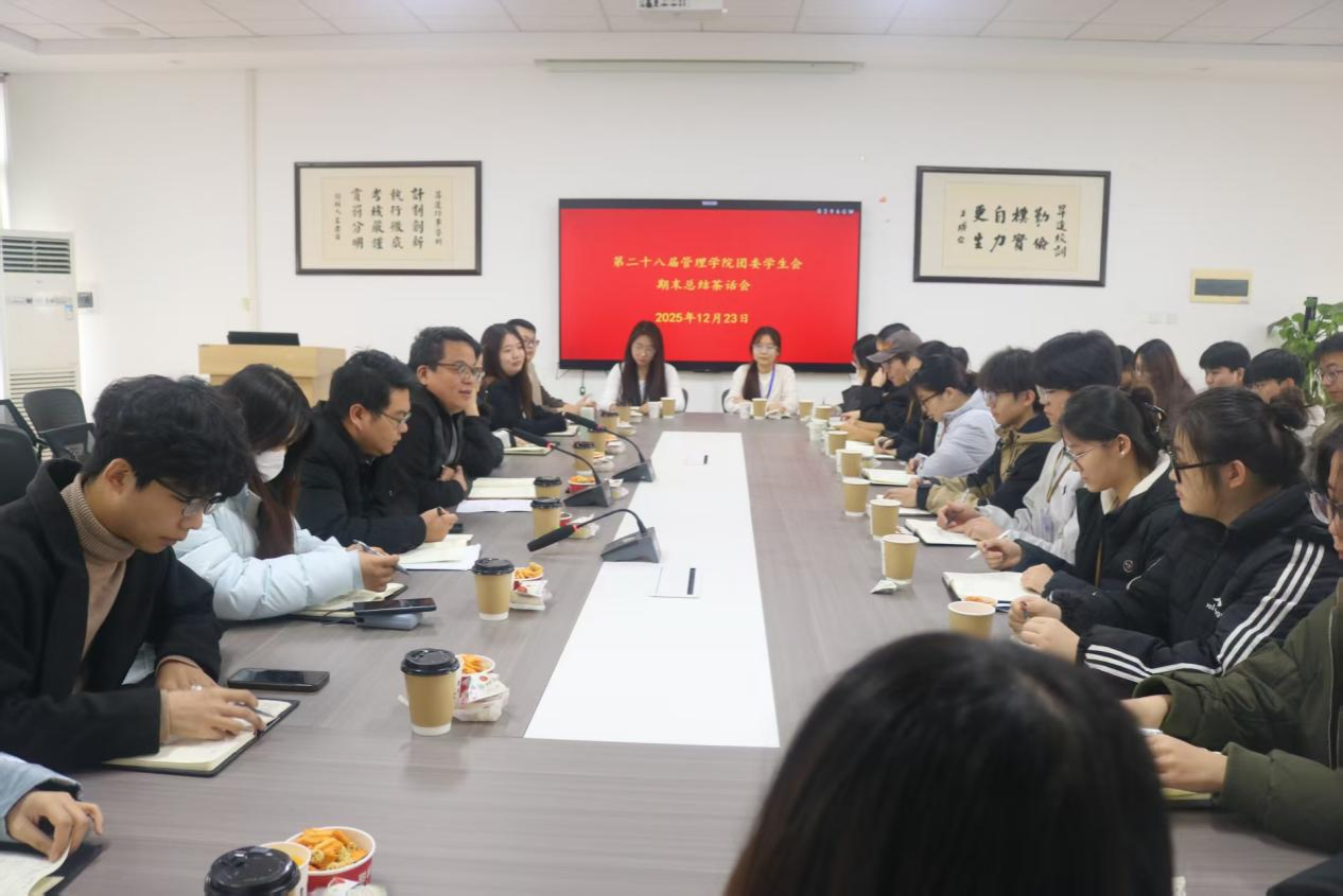 期末将至,为加强团学会各部门之间的沟通协作,总结本学期工作经验,缓解团学会成员们的学业与工作压力,管理学院团学会于2025年12月23日13时在管理学院教学二号楼209教室举办2025-2026学年第一学期期末总结茶话会。管理学院党委副书记许广庆老师、团委常务副书记马超老师,以及第28届主席团成员、各部门部长与干事代表齐聚一堂,共话成长与发展。
