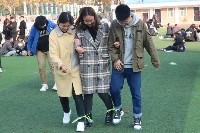 第二场的“绑腿游戏”在一声声“一二、一二……”的口号下,各班班干齐头并进完成比赛。