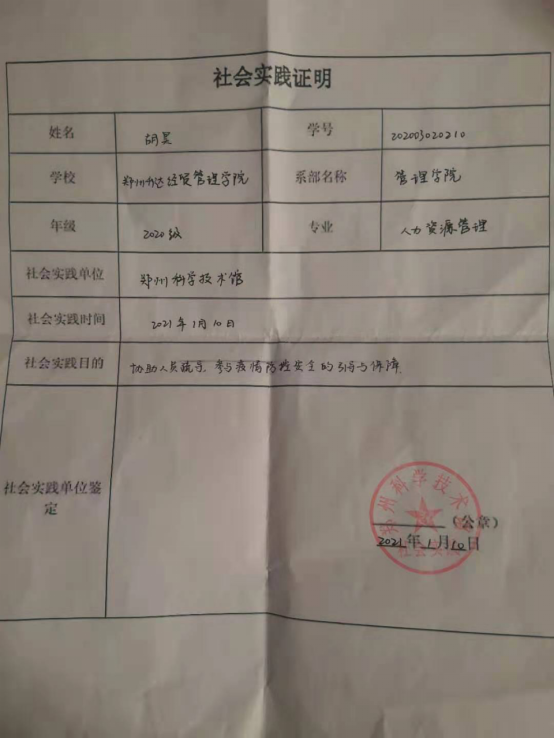 胡昊,学习委员,管理学院2020级人力资源管理本科2班。今年寒假新冠疫情的危险还未彻底解除,胡昊想要为社会贡献自己的一份力量。为此他参加郑州科技馆疫情防控志愿者活动。2021年1月10日开始在郑州科技馆的参与协助拥挤人员的疏导,体温检测、监督口罩佩戴与健康码的扫描,场地的喷洒与消毒等等工作,用实际行动贯彻疫情防控的落实。