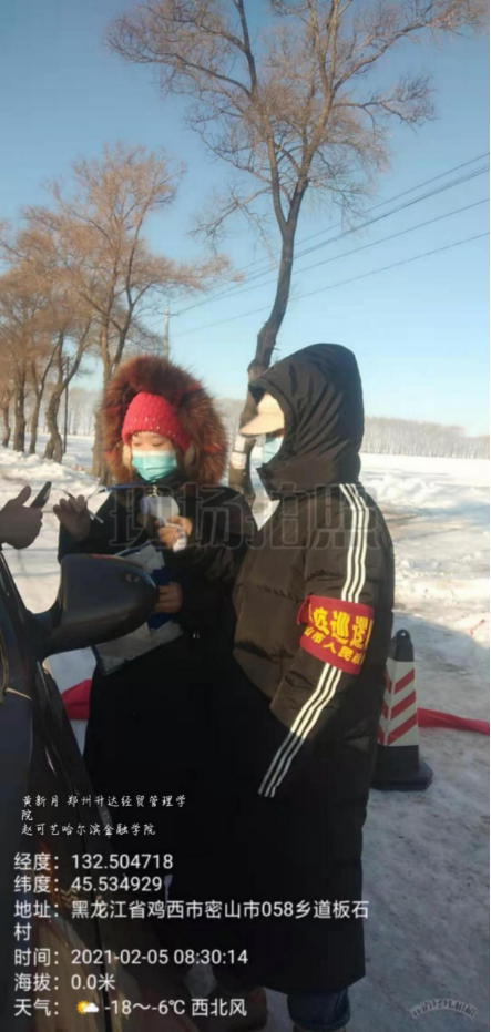 黄新月,文艺委员,管理学院工商管理本科2班。在寒假期间,黑龙江被疫情困住。临近春节期间,乡里响应国家号召在村口设立卡点,黄新月自发报名志愿者,到卡点值班,主要工作就是对返村人员进行登记,测温,扫码,报告,对出入人员进行记录,宣传防疫知识等。
