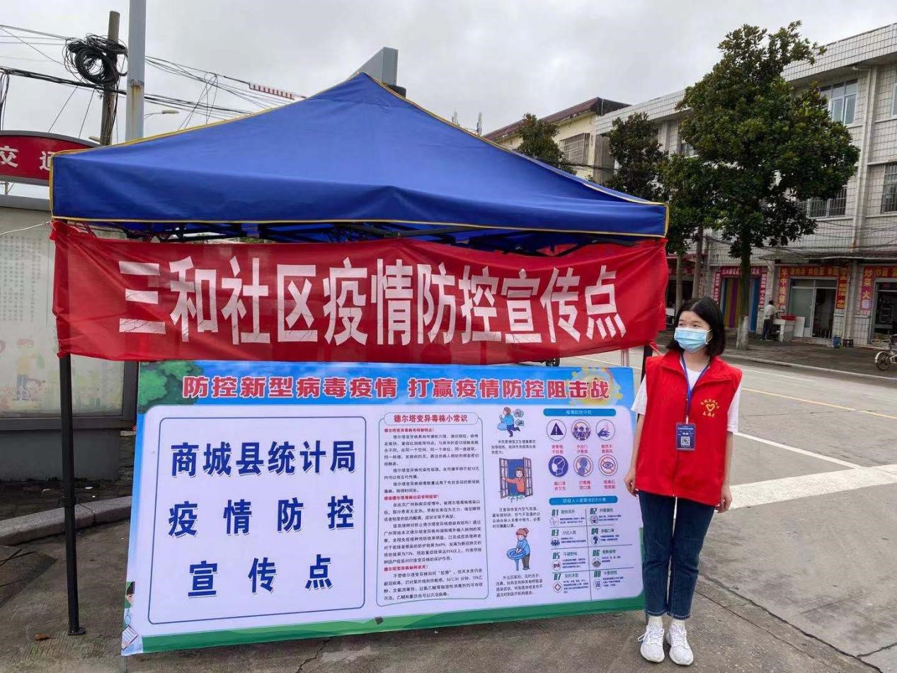 杨小雨,19级旅本一班共青团员。在得知疫情反弹,疫情防控工作加重时,杨小雨同学积极响应商城县政府的号召,主动参与到防疫一线的志愿工作中,由所在社区分配到信阳市商城县赤城街道卡点值班,主要负责社区外来人员登记、体温检测且消毒,督促街道群众戴好口罩以及参与后续场地布置消毒等工作。
