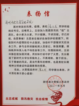 同心战役担使命,协力抗洪显初心。从2020年春节的新冠肺炎疫情,到“720”特大暴雨,再到卷土重来新冠疫情,面对这两场艰难战役,尉氏县大营镇石槽王村,现就读于郑州升达经贸管理学院,共青团员,张云龙,挺身而出,冲锋在前,在行动中践行初心,勇担使命。